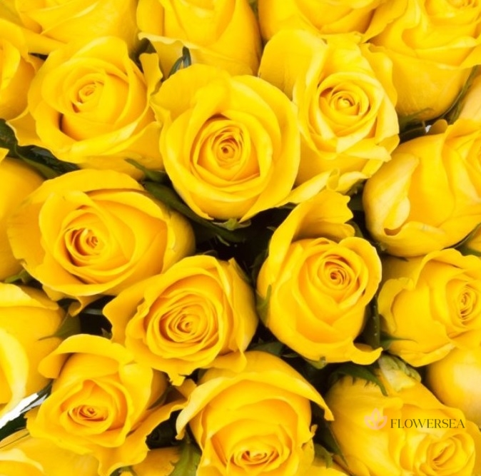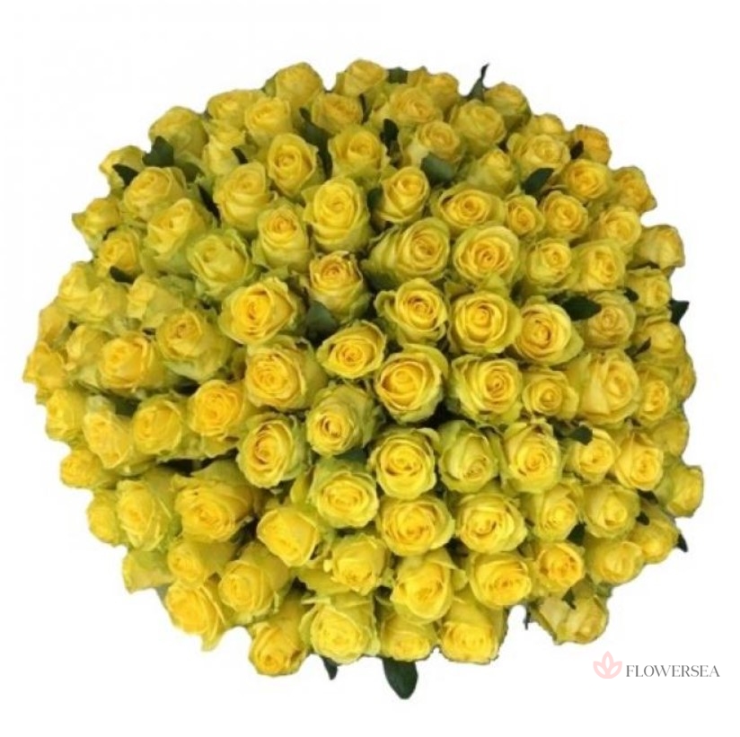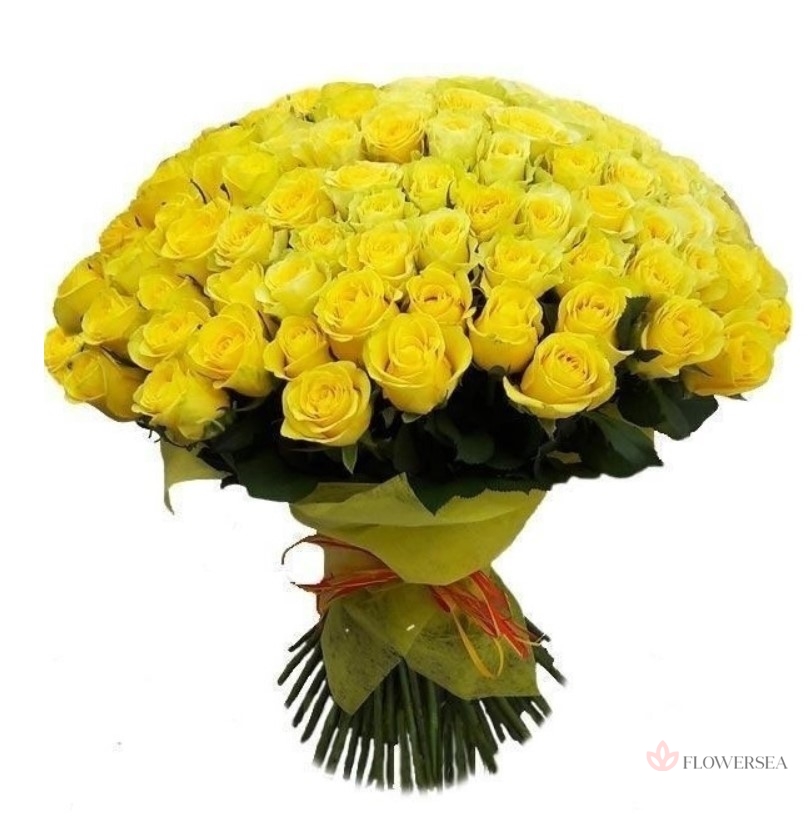 Жовті троянди в величезному і розкішному букеті, красиво оформлені атласною стрічкою. Наче сонце в руках свого щасливого власника, теплі і барвисті троянди наповнять простір своїм теплом, світлом, і гармонією. Такі квіти дарують з красномовними побажаннями любові, тепла, добра, багатства і радості. Безумовно такий подарунок-найкращий спосіб передати всі ці побажання, і подарувати найяскравіші емоції.