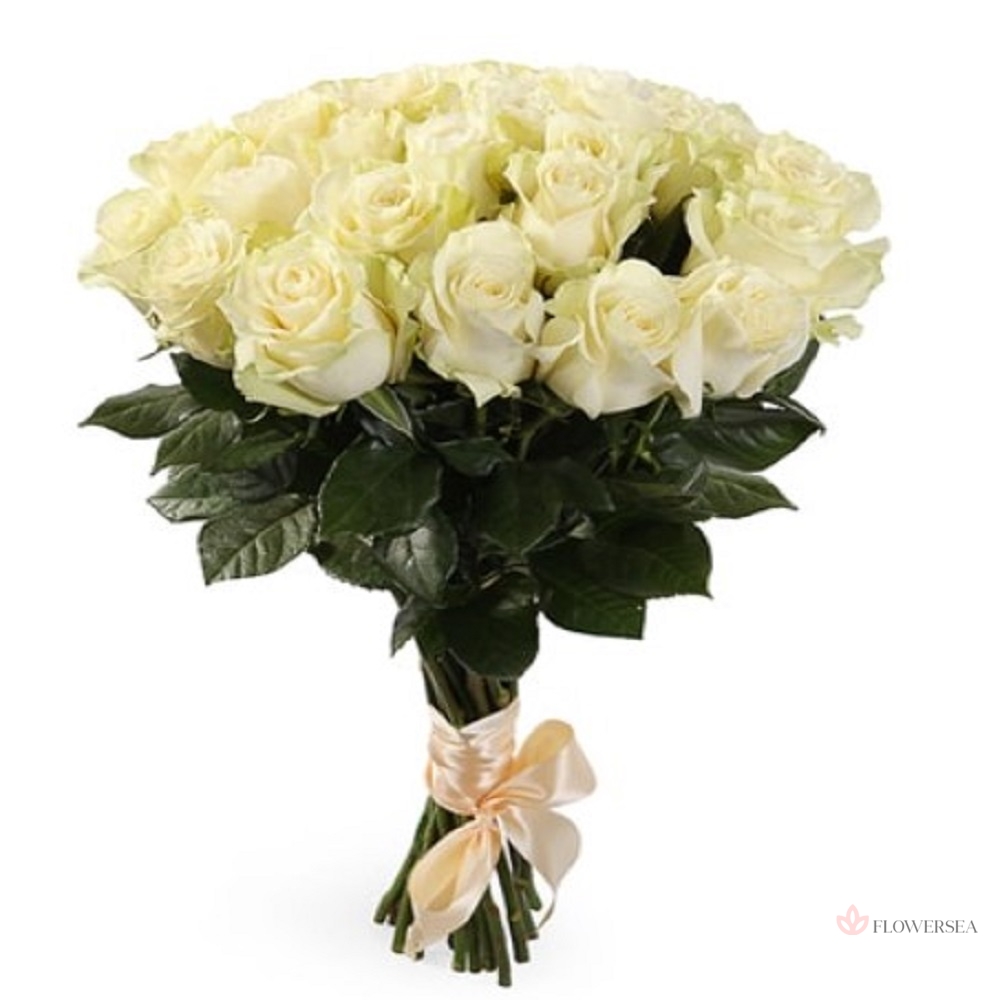 Букет з білих троянд сорту Аваланж, оформлений листами декоративної зелені. Красивий і стильний подарунок, який завжди подарує приємні і радісні емоції.