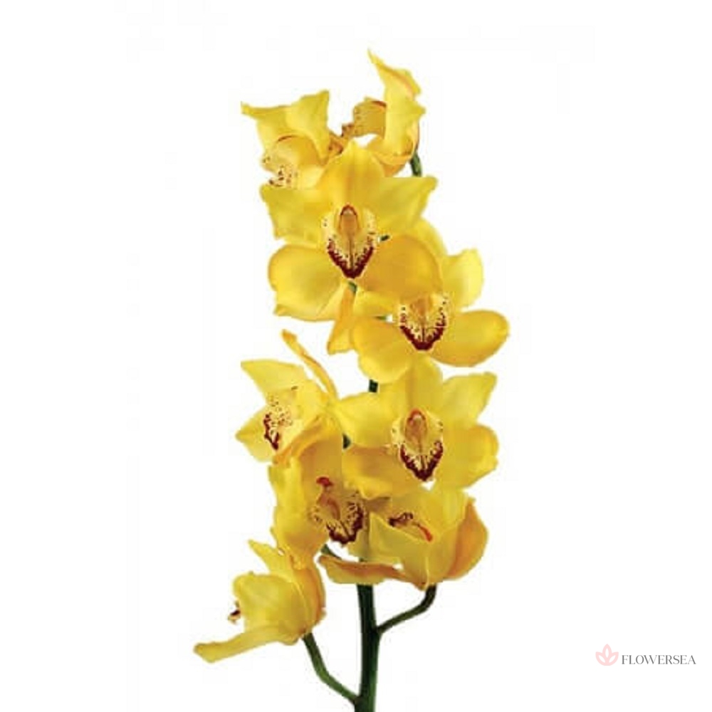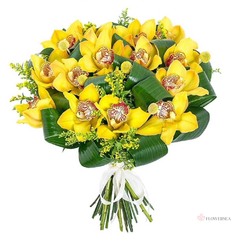 Букет з 15 квітів орхідеї Цимбідіум з листами аспідистри, гілок солідаго, і атласної стрічки.