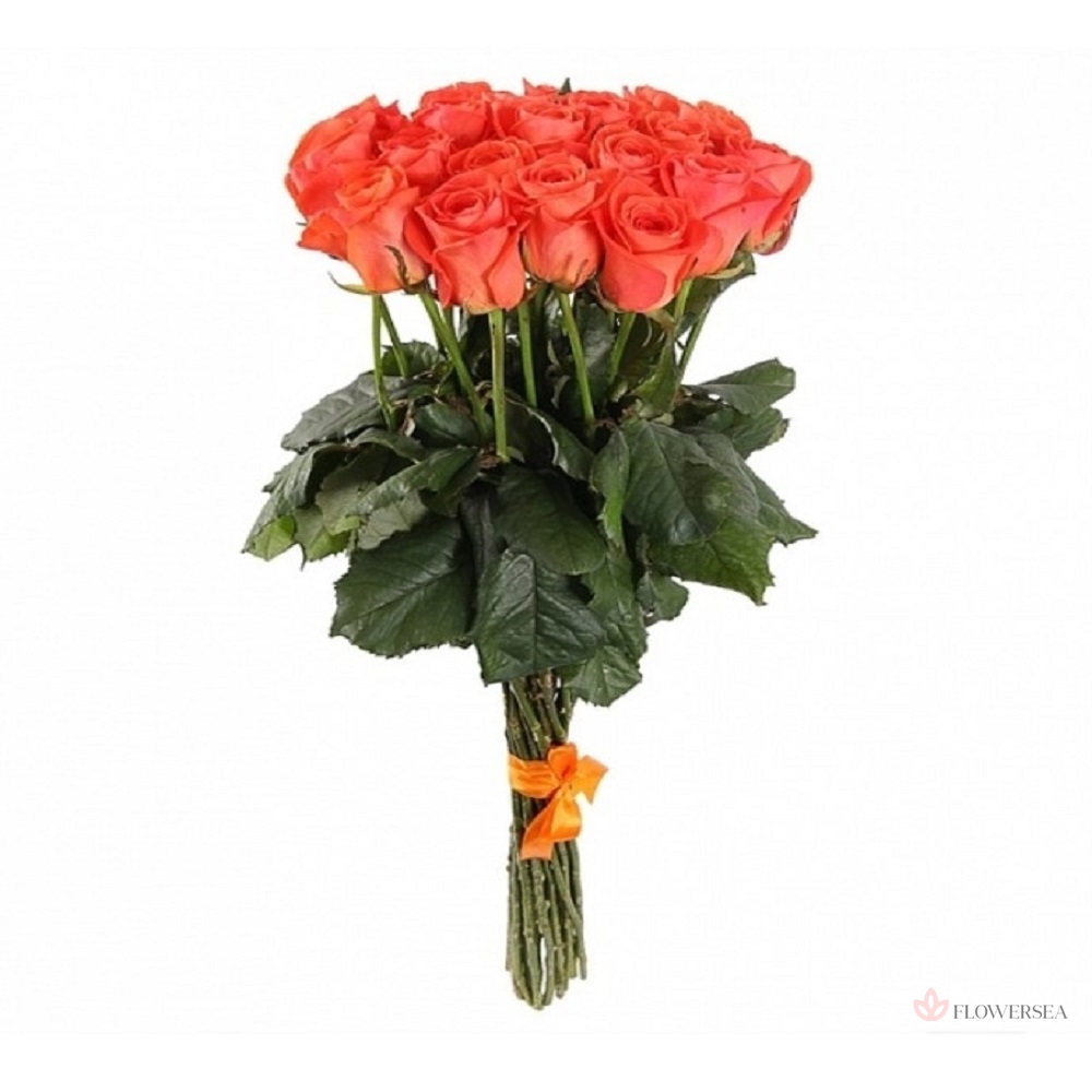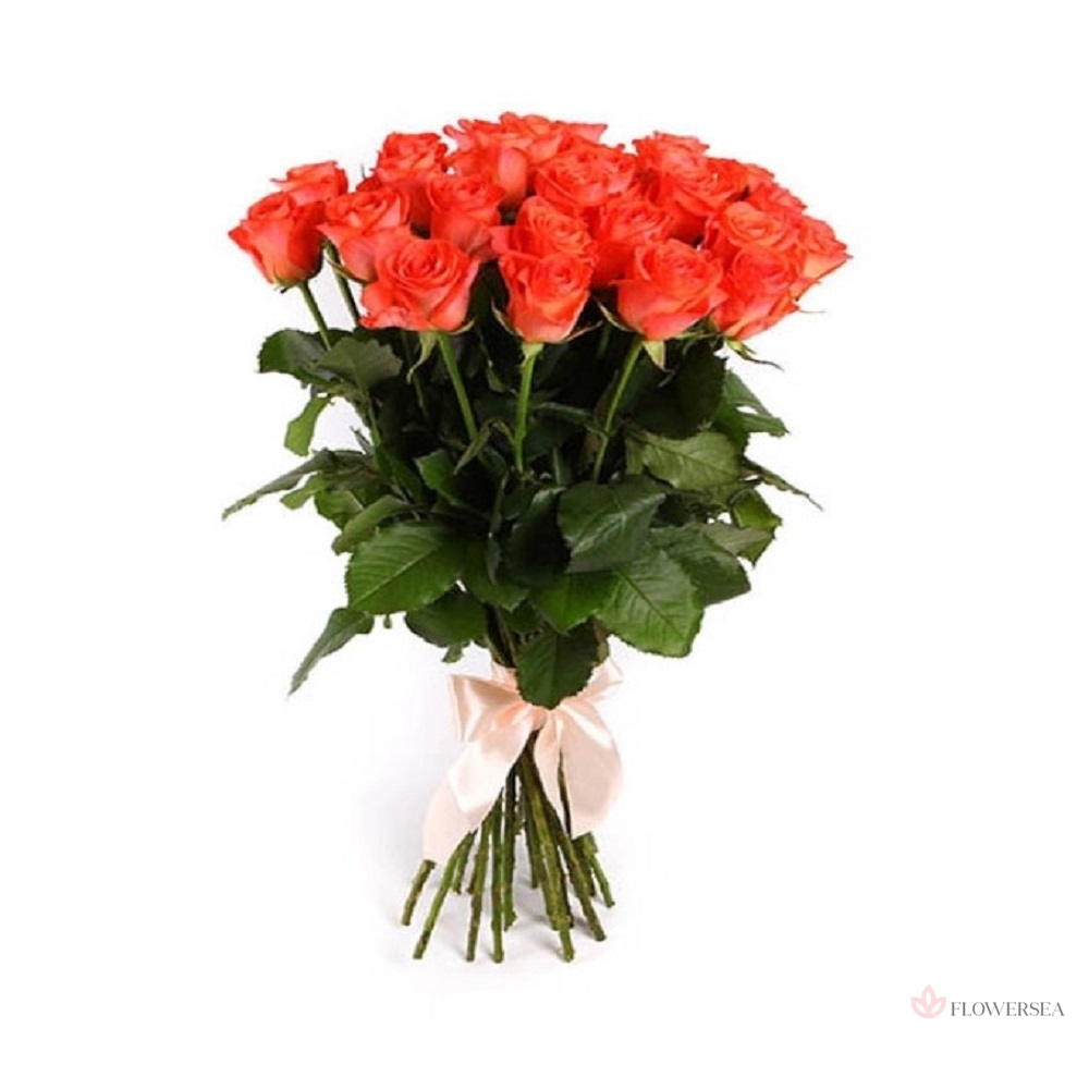 Букет красивих троянд коралового кольору з високим бутоном, оформлених атласною стрічкою. Троянди такого кольору прийнято дарувати як символ захоплення, подяки, підтримки, з побажаннями щастя, благополуччя і удачі. Така символічність робить ці квіти універсальним подарунком, який завжди доречний, актуальний, і оригінальний.