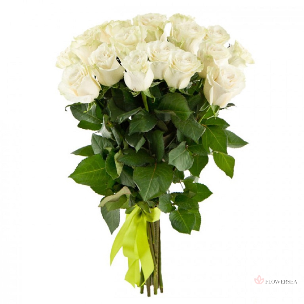 Букет з 19-ти білих троянд сорту Аваланж, який оформлений атласною стрічкою. Білі троянди- символ чистоти, невинності і щирості, подарувавши такий букет можна підкреслити ці якості у одержувача.