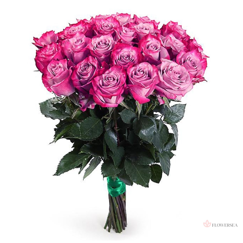 Букет з чудових двоколірних троянд Діп Пьорпл, красиво оформлених атласною стрічкою. Милий і ніжний подарунок для жіночної і витонченої леді.