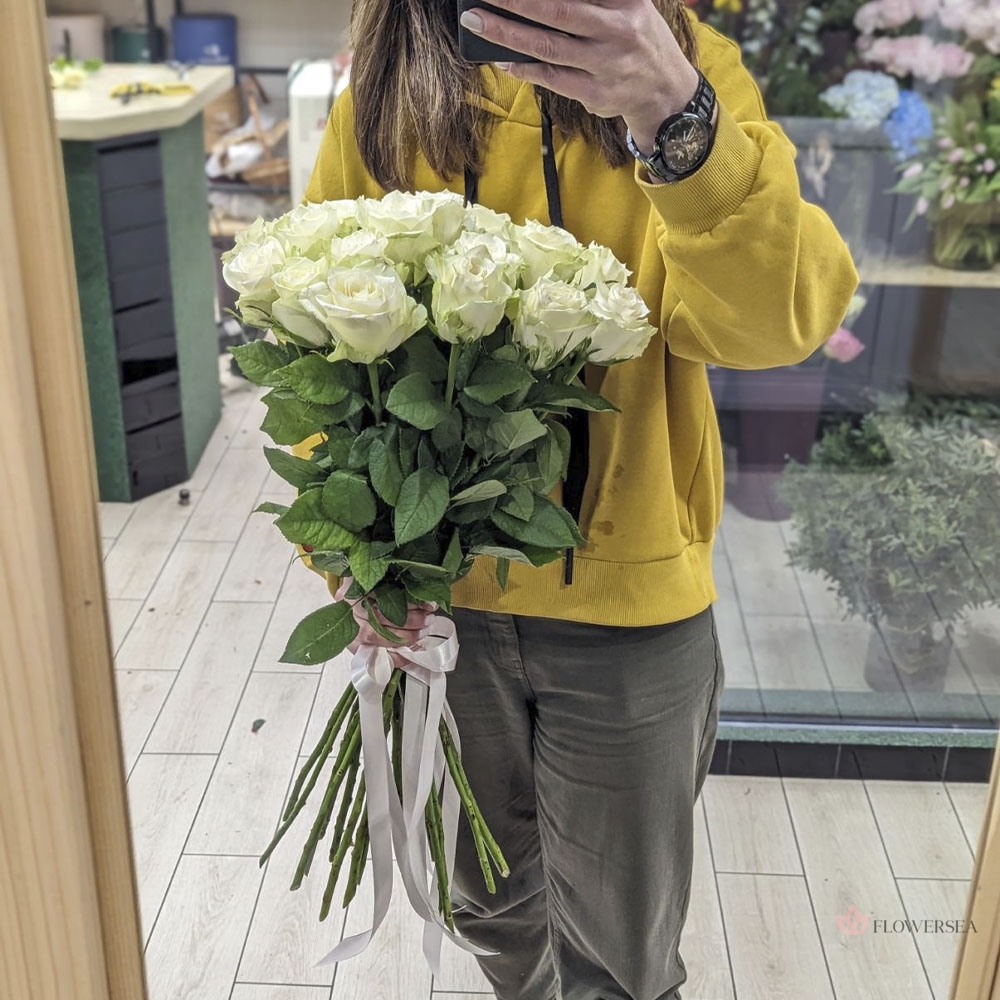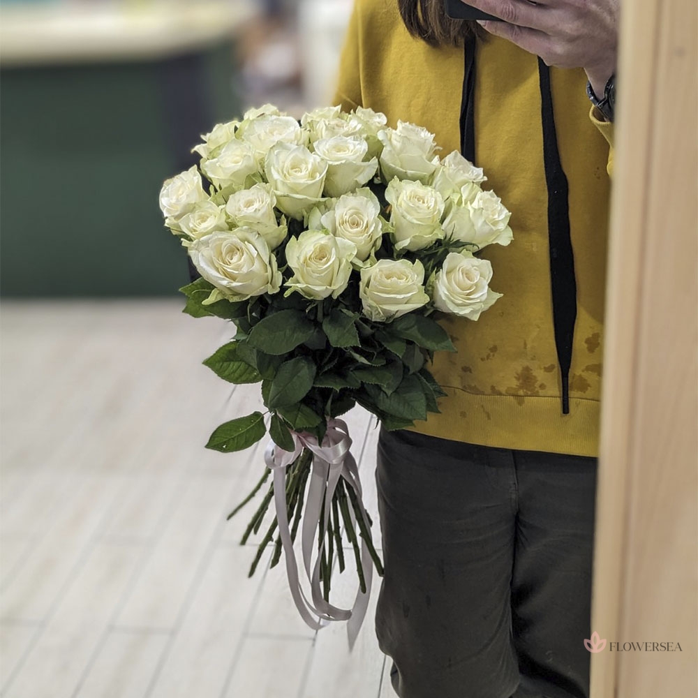 Букет з 21 троянди Аваланж, красиво оформлених атласною стрічкою. Букет з ніжних троянд з ледь помітним ароматом, і натяком своїй власниці на її жіночність і витонченість.