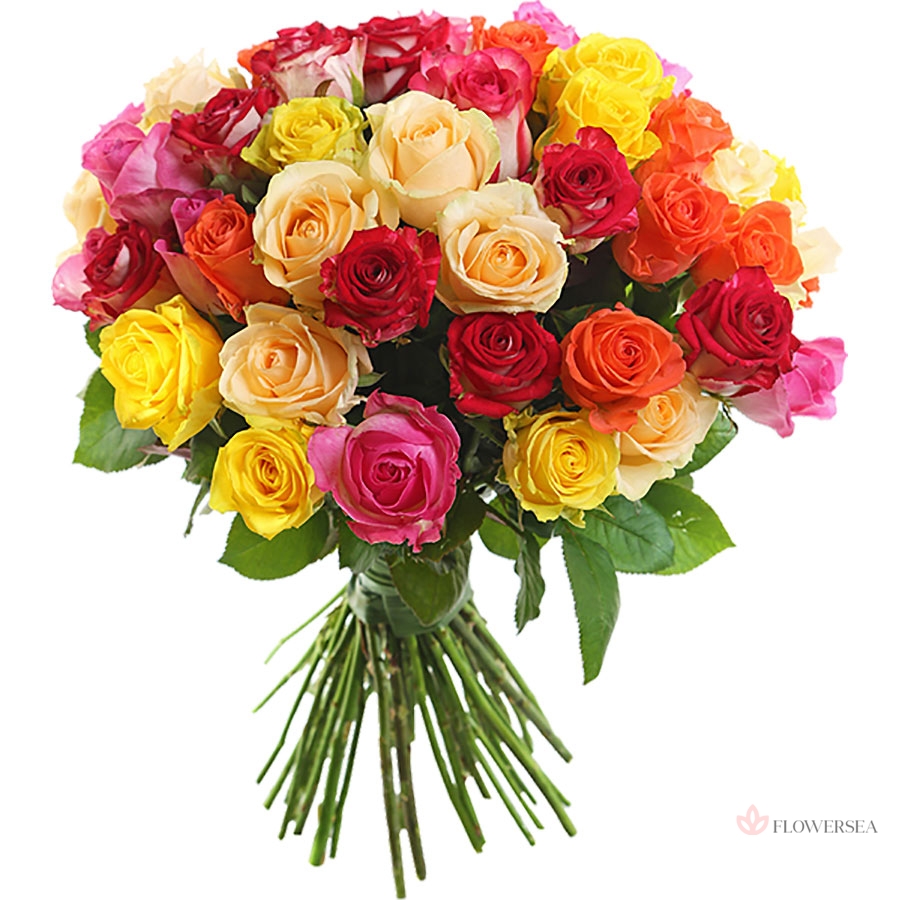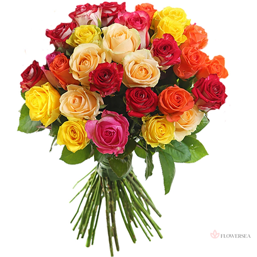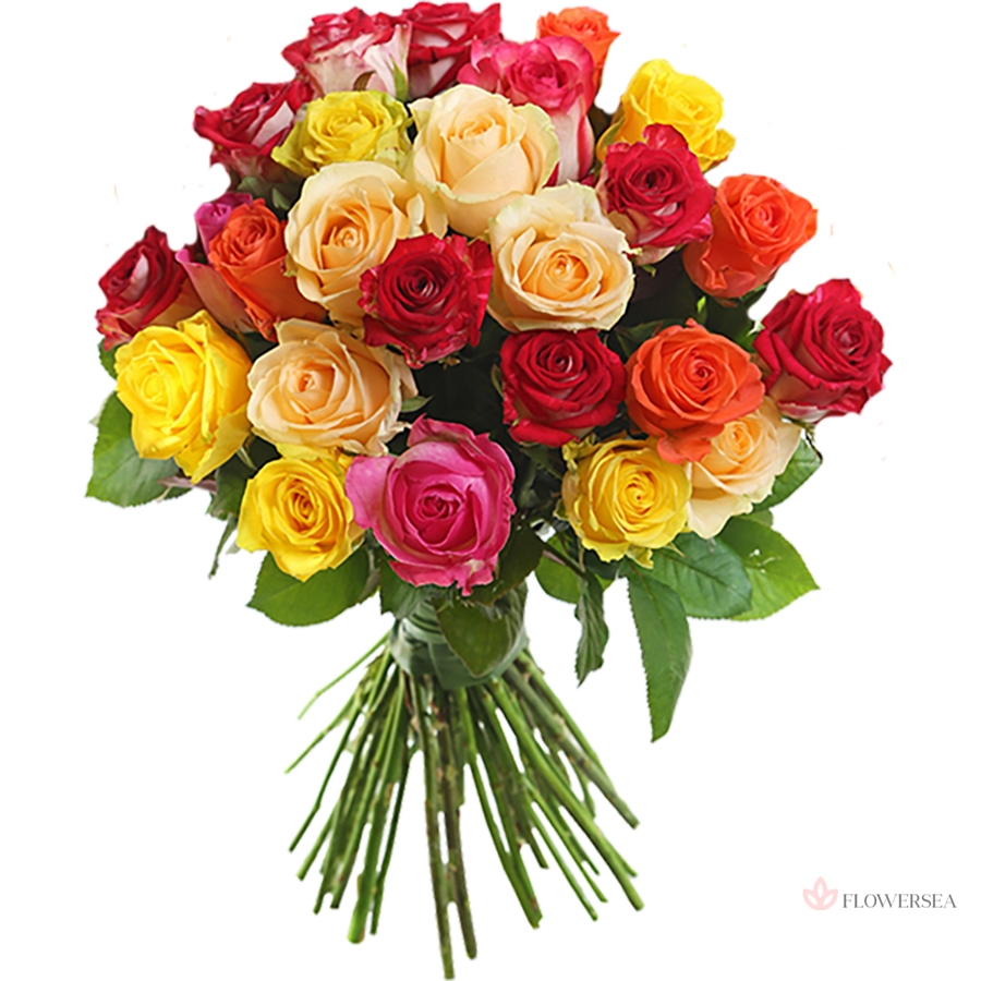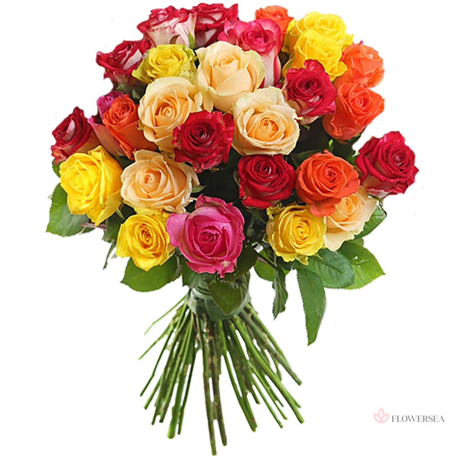 Букет різнокольорових троянд, який демонструє найтепліші побажання. Троянди оформлені атласною стрічкою, що формує шикарний букет. Безсумнівно яскравий сюрприз, і надихаючий подарунок.