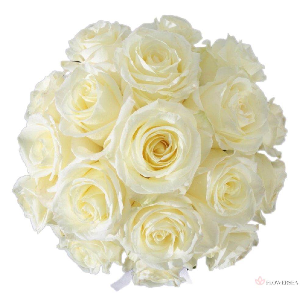 Букет з 25 еквадорських сніжно-білих троянд, оформлених атласною стрічкою.