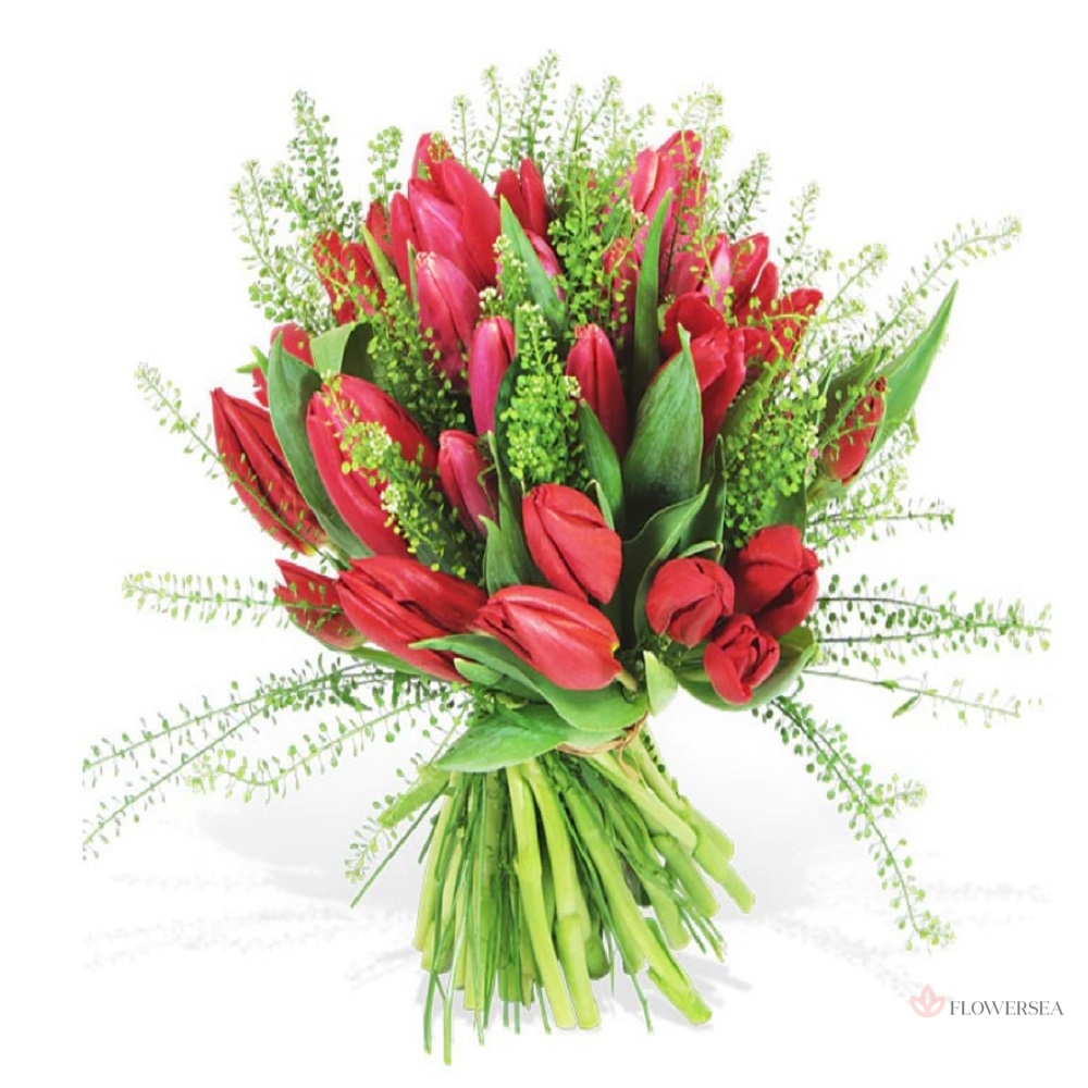 Букет з 31 червоного тюльпана з зеленню, оформленого атласною стрічкою.
