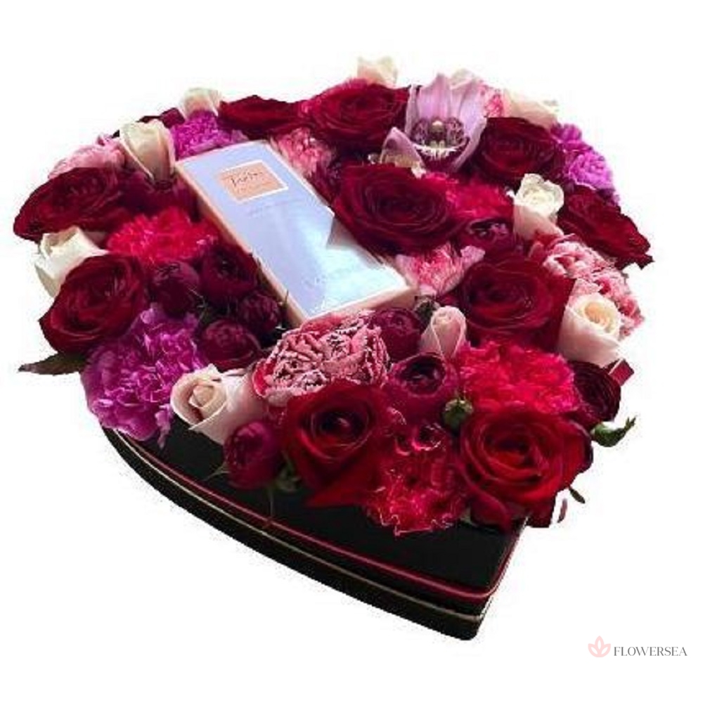 Мікс з яскравих і барвистих троянд, гвоздик, орхідей, кущових троянд в декоративній коробці.