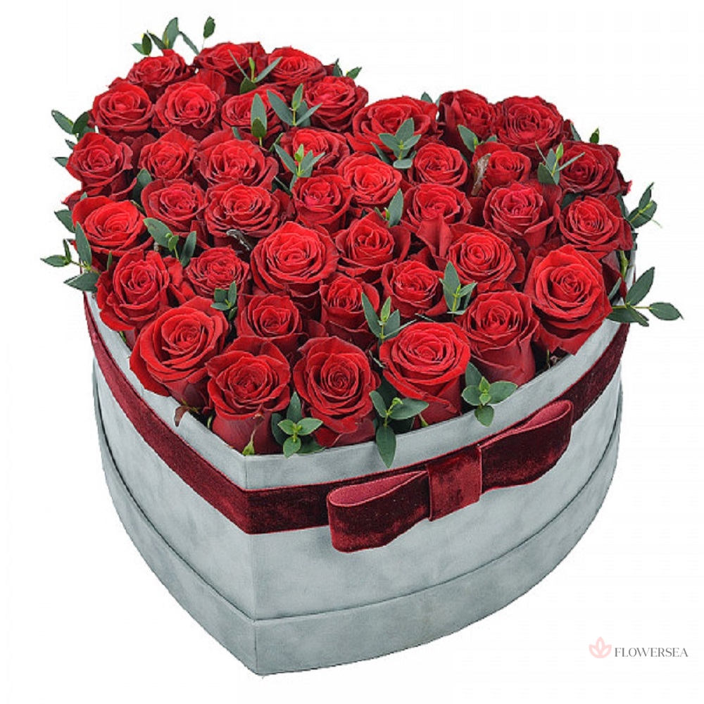 Оксамитові червоні троянди в декоративній коробці з зеленню.