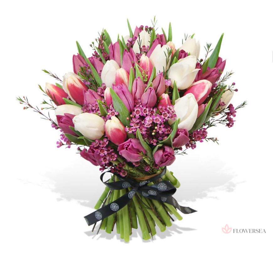 Гарний букет з ніжних, весняних тюльпанів з гілочками хамелаціума, оформлених атласною стрічкою.