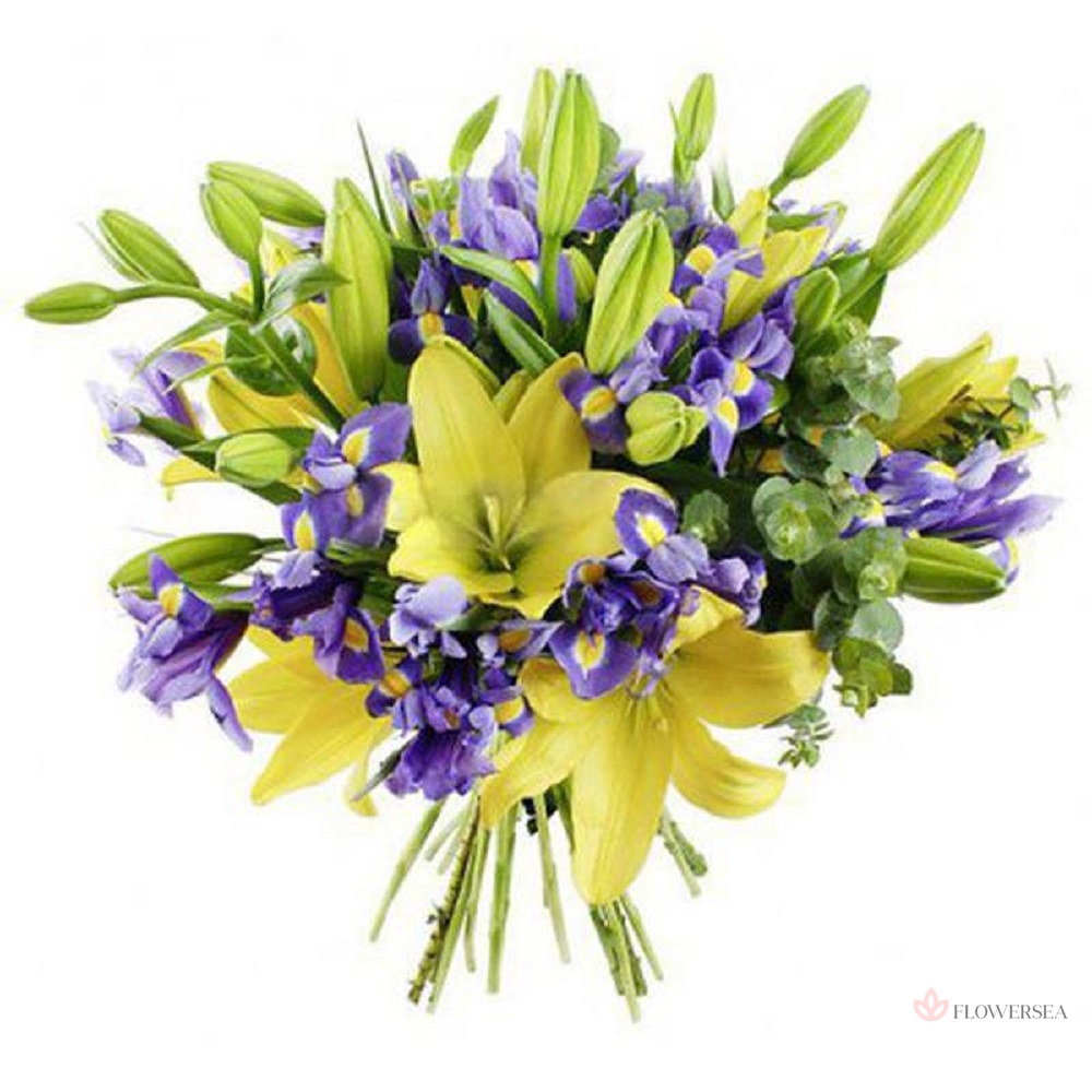 Букет з 5 гілок жовтих лілій, та 20 синіх ірисів з гілками евкаліпта, оформлений атласною стрічкою.