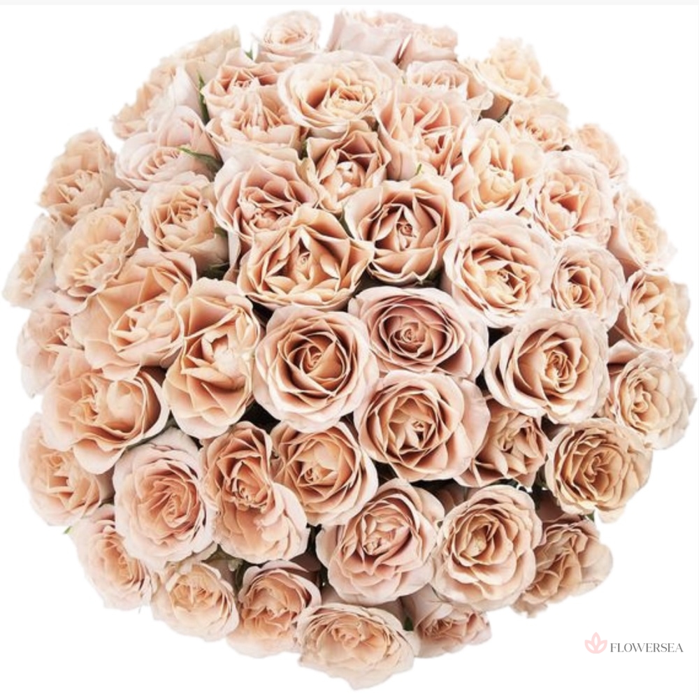 Букет з шикарних, неординарних, і надзвичайно красивих півоновидних троянд кольору капучіно, оформлених атласною стрічкою.