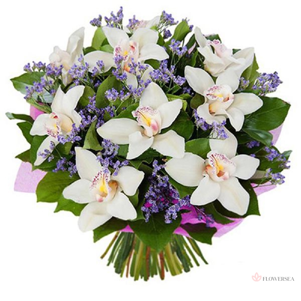 Букет з 9 квітів орхідеї Цимбідіум, гілочок статиці, листів рускуса, і упаковки.