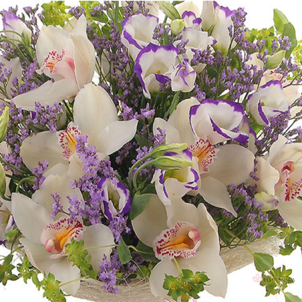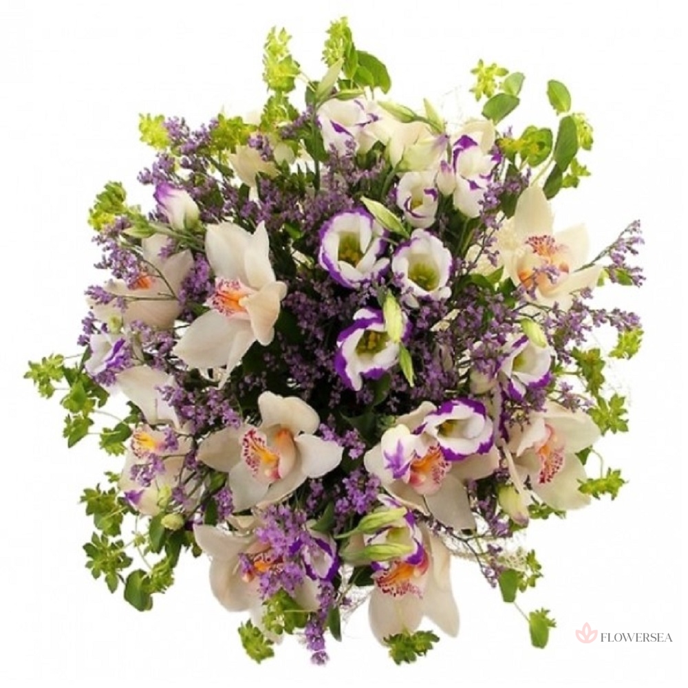 Букет з 10 квітів орхідеї Цимбідіум, 5 гілок еустоми, гілок буплеурума, декоративної зелені, і упаковки.