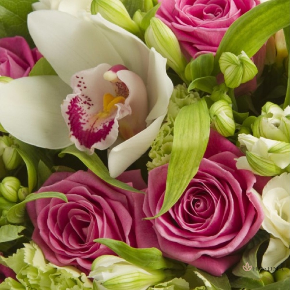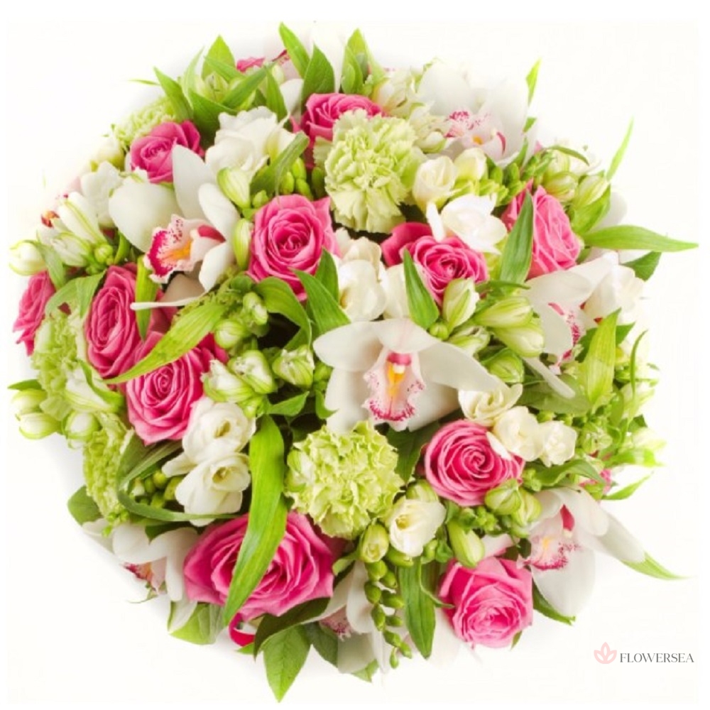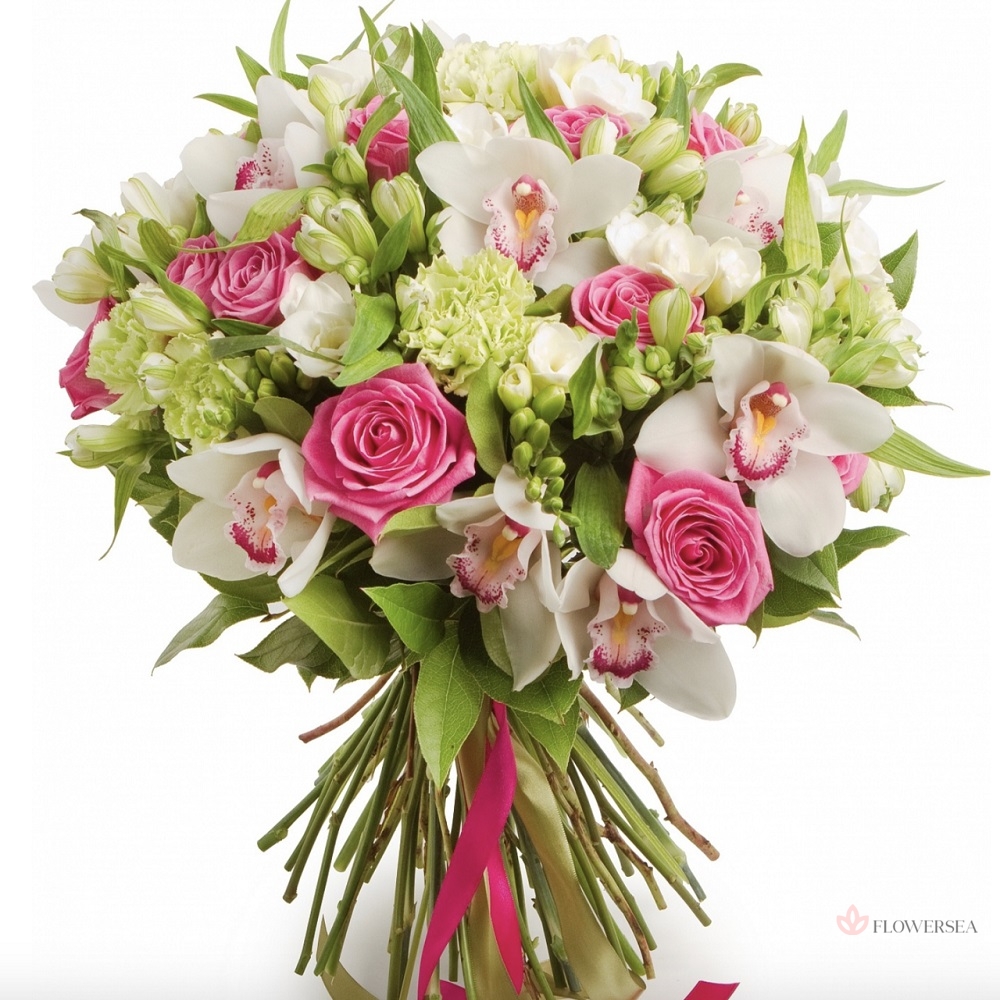Чудовий букет з 15 рожевих троянд, 6 салатових гвоздик, 5 квітів орхідеї, 10 фрезій, 10 альстромерій, листів салалу і атласної стрічки.