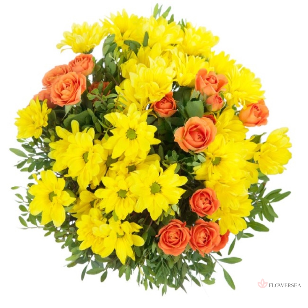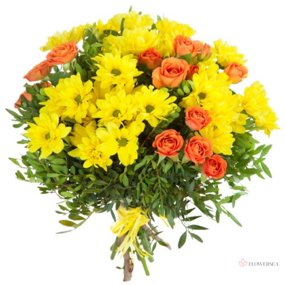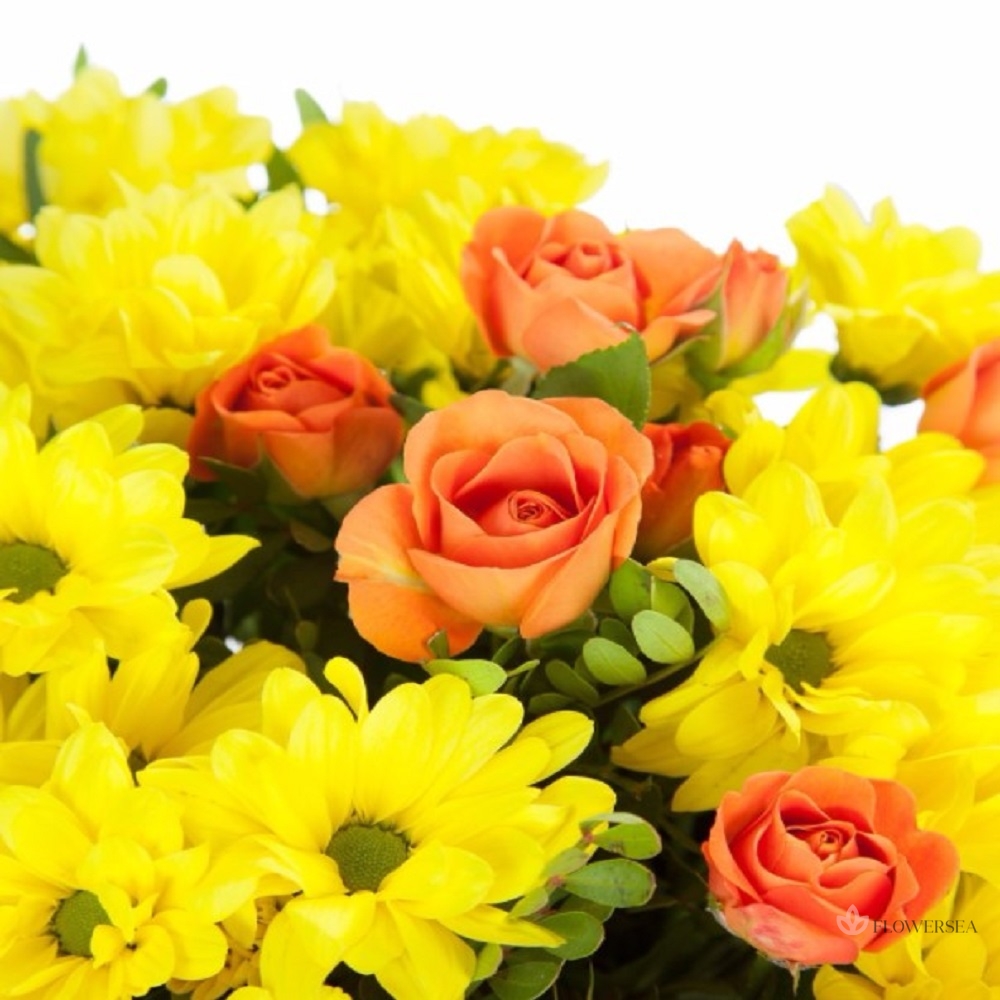 Букет з 4 гілок сонячних хризантем, і 3 гілок кущових троянд з гілками евкаліпта, зав'язаний рафією.