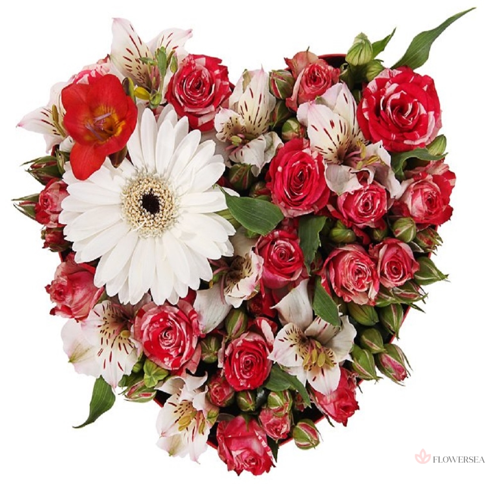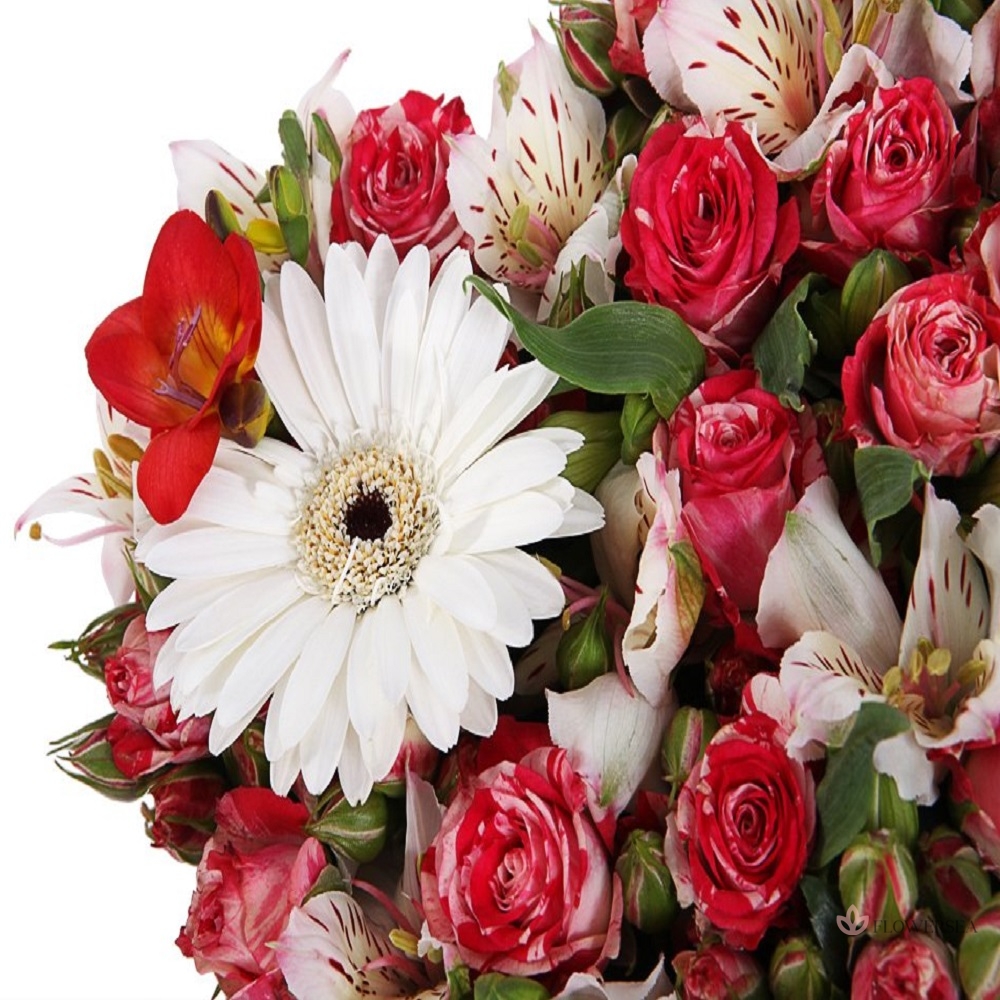 10 гілок кущових троянд, 1 гербера, 5 гілок альстромерій, 1 фрезія стануть романтичним подарунком в декоративній коробці.