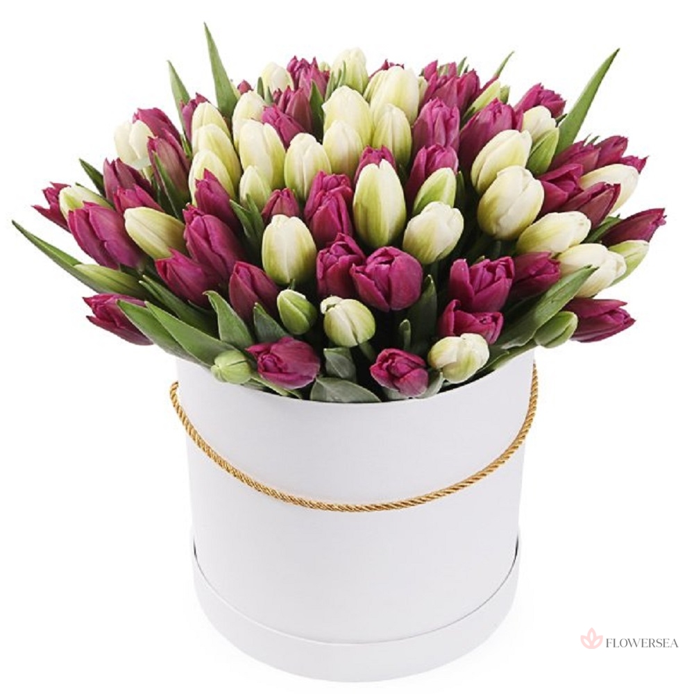 101 біло-пурпурний тюльпан в коробці