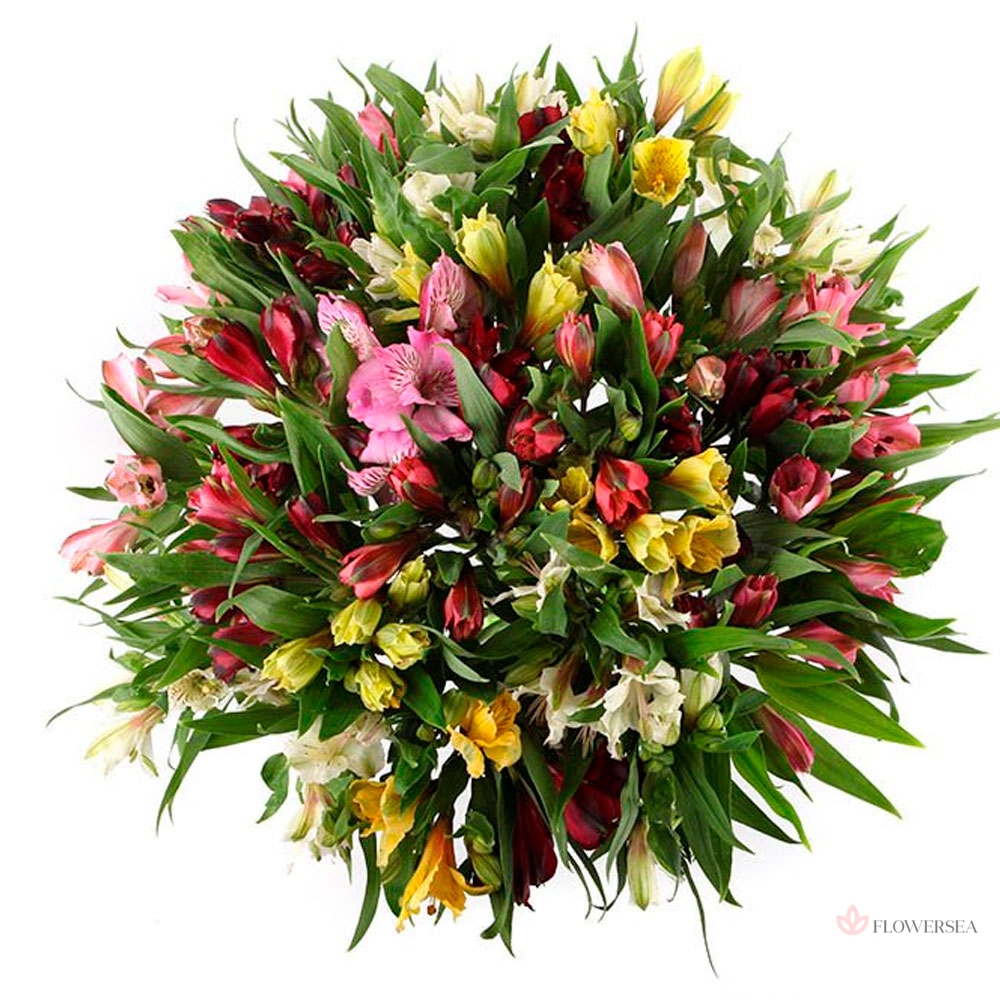 Букет з барвистих і ніжних квітів альстромерій, який красиво оформлений атласною стрічкою. Володіючи великою різноманітністю кольорів і стилів, завдяки своїм яскравим відмітинах і безпрецедентно довгому життю, альстромерія є незамінною квіткою.