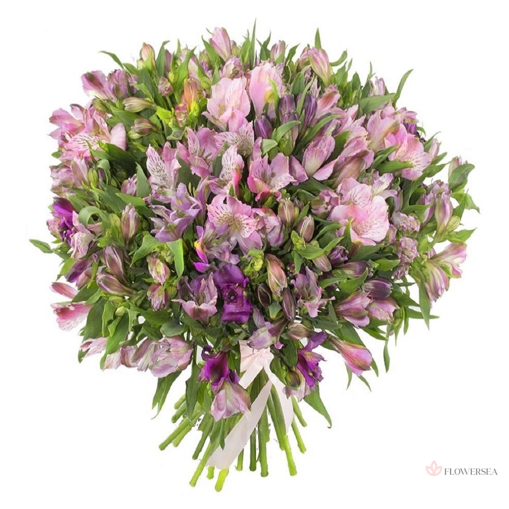 Бузковий мікс з ніжних альстромерій, красивих весняних квітів, що символізують дружбу, нові починання, радісні події і зміни. Букет оформлений атласною стрічкою, і буде чудовою прикрасою кожного приводу і свята.