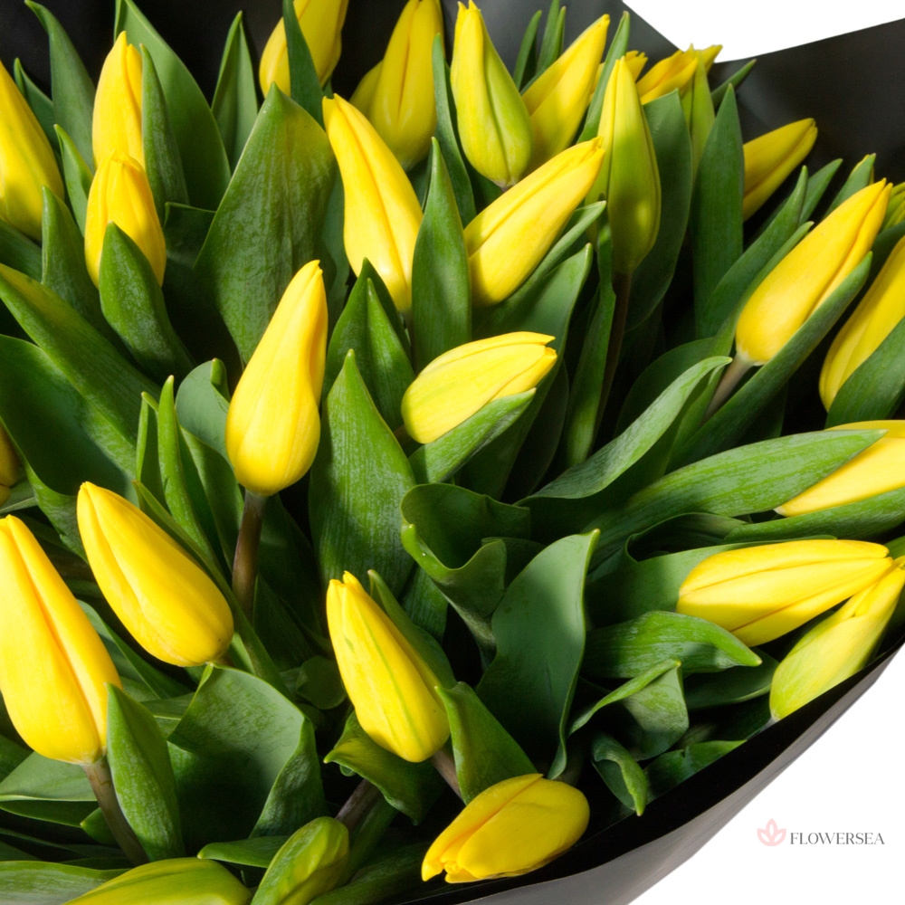 Букет із сонячних квітів весни, красивих, теплих та ніжних жовтих тюльпанів красиво оформлений у папір та зав'язаний атласною стрічкою. Тюльпани та упаковка можуть бути будь-якого обраного кольору.