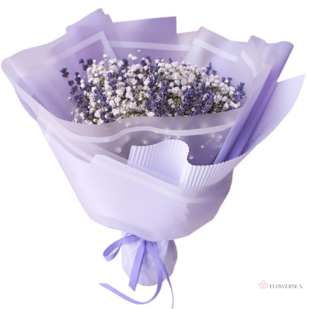 Букет з ніжних гіпсофіл з ароматною лавандою в упаковці.