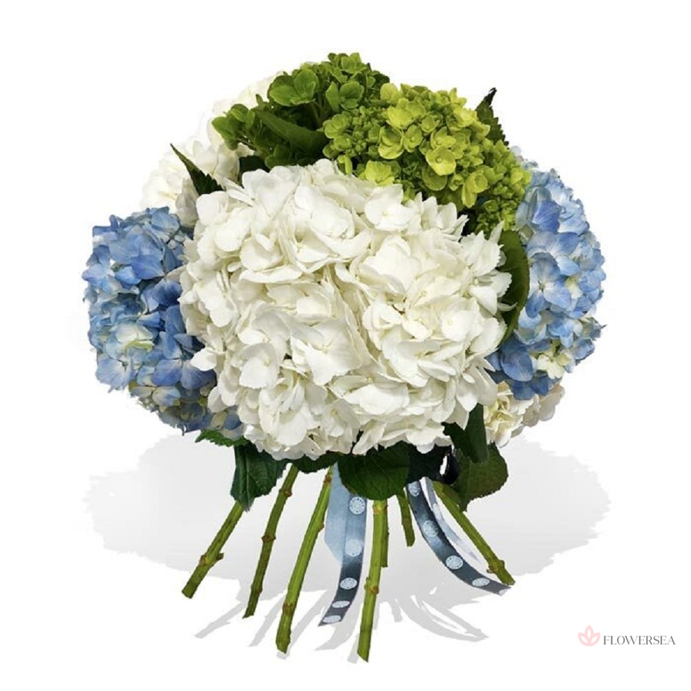 Букет з 7 гілок ніжної гортензії, оформлених стрічкою.
