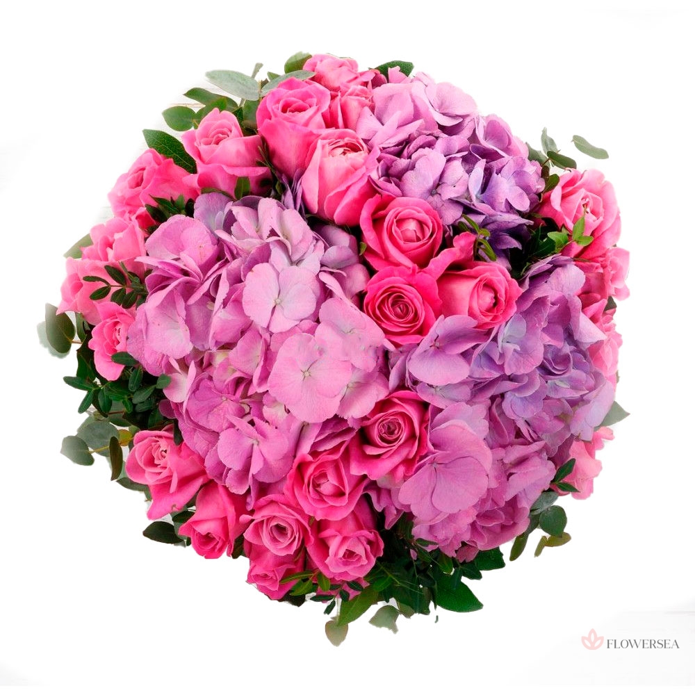 Букет з 3 шикарних гортензій, 18 ніжних рожевих троянд, гілок евкаліпта, гілок рускуса, і атласної стрічки.