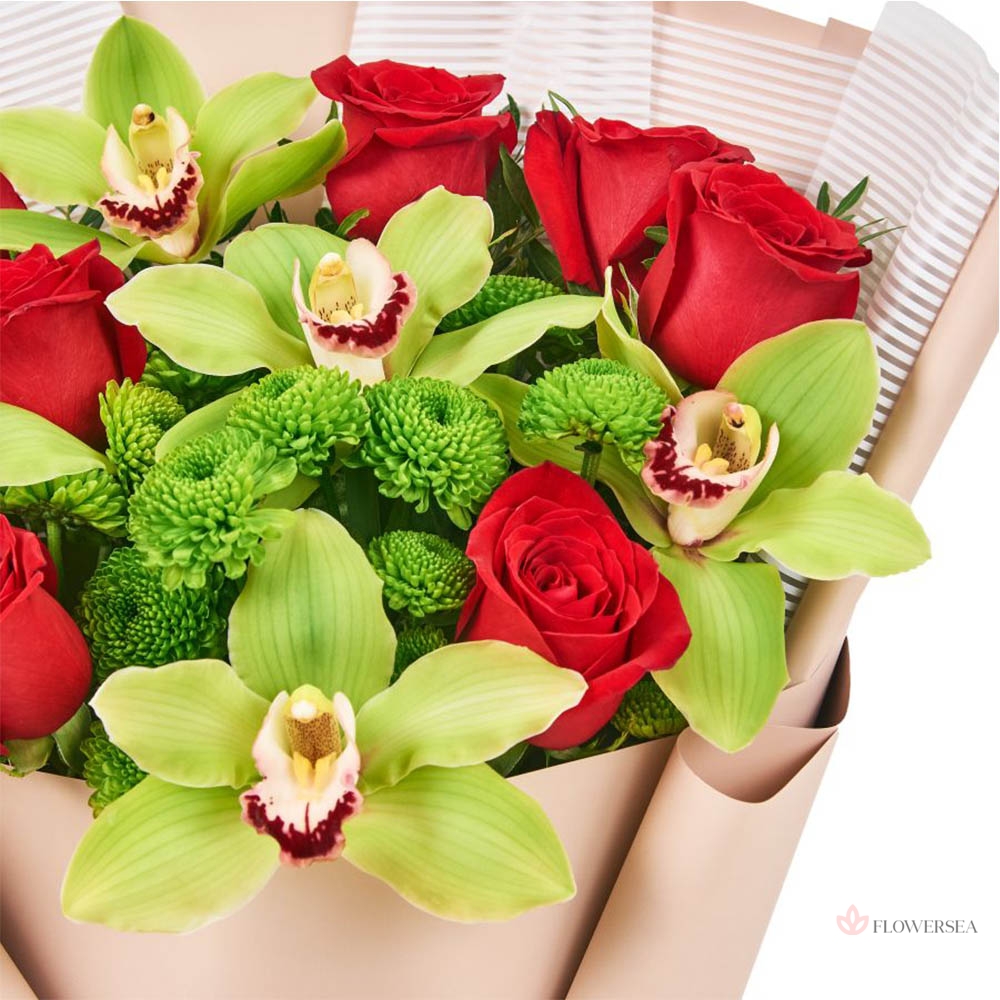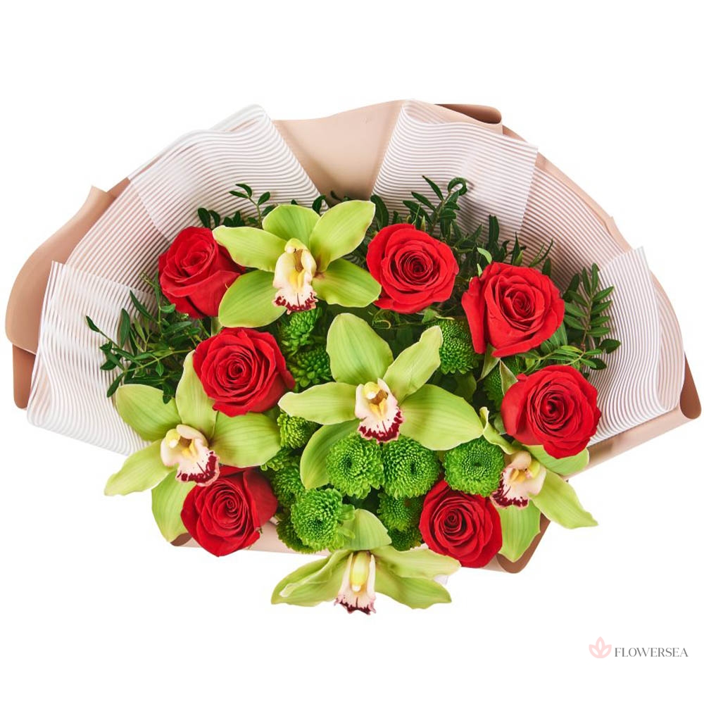 Яскравий букет з 7 червоних троянд, 5 орхідей, 3 гілочок хризантеми, гілок евкаліпту та упаковки. Квіткову композицію можна виконати в будь яких кольорах на ваш смак та вручите в усіх населених пунктах країни.