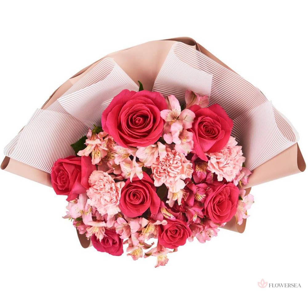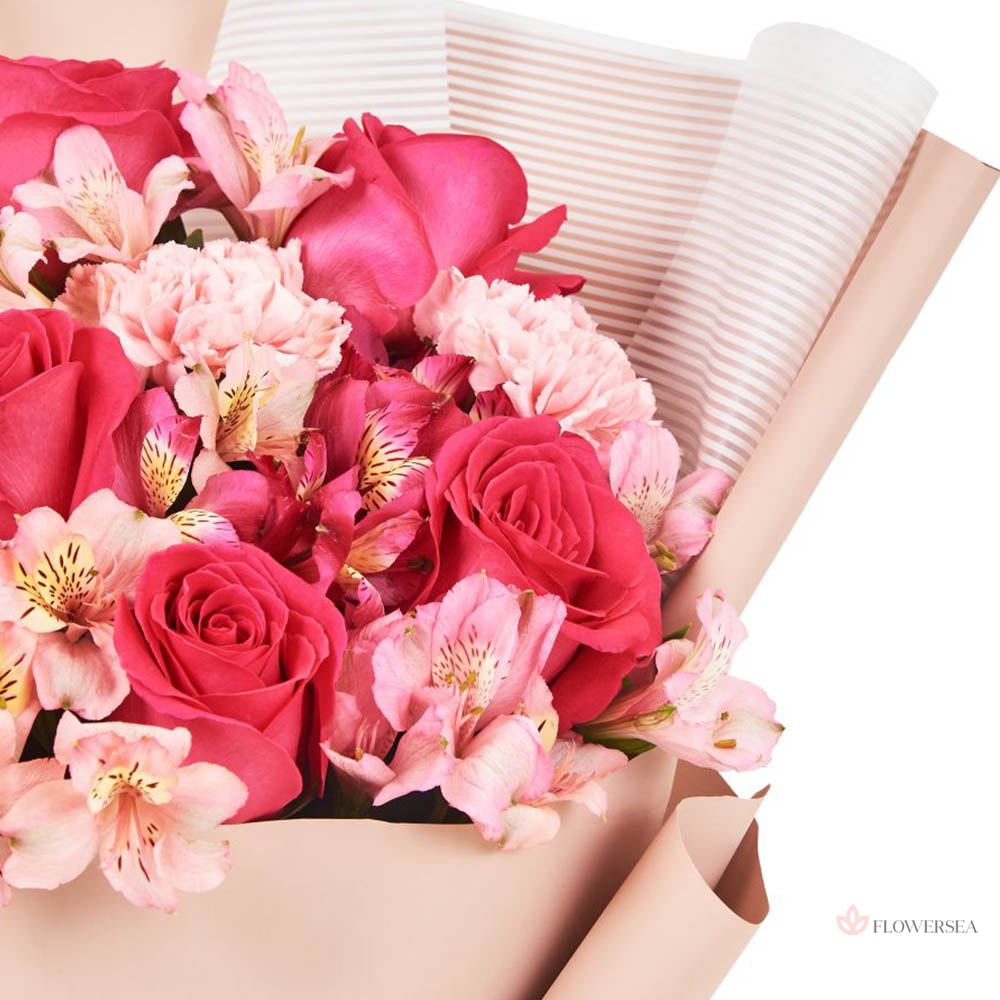 Стильний і жіночний букет для наймиліших леді, виконаний з 7 рожевих троянд, 3 ніжно рожевих гвоздик, 5 гілок альстомерії та декоративної упаковки з атласною стрічкою. Такий подарунок буде чудовим сюрпризом з нагоди романтичного побачення, Дня народження, Дня весілля, поздоровлення колеги, подруги і, безумовно, навіть звичайний день перетворить на свято.