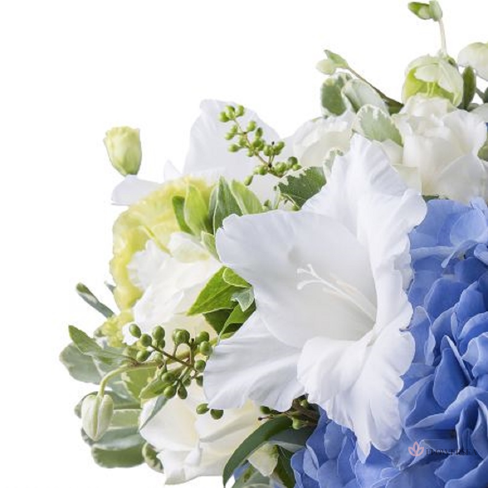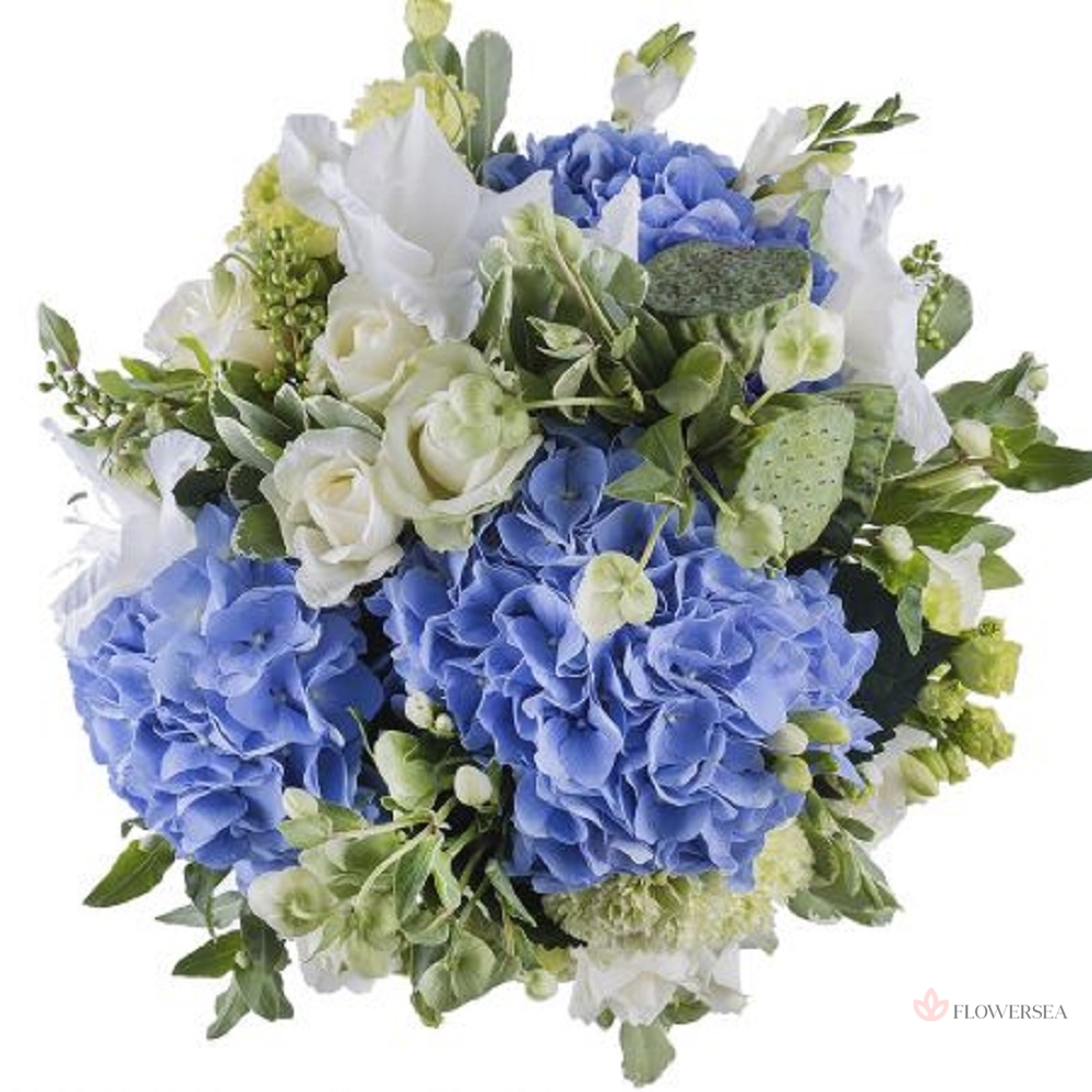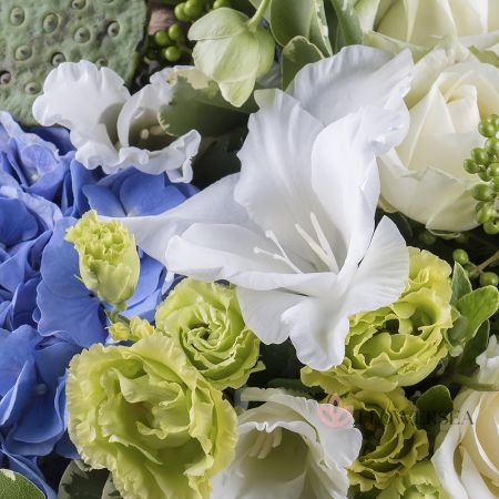 Букет з 3 гілок гортензій, 5 білих фрезій, 4 гвоздик, гілки гладіолуса (по сезону), 3 лотусів, 4 еустом, гілок евкаліпта і атласної стрічки.