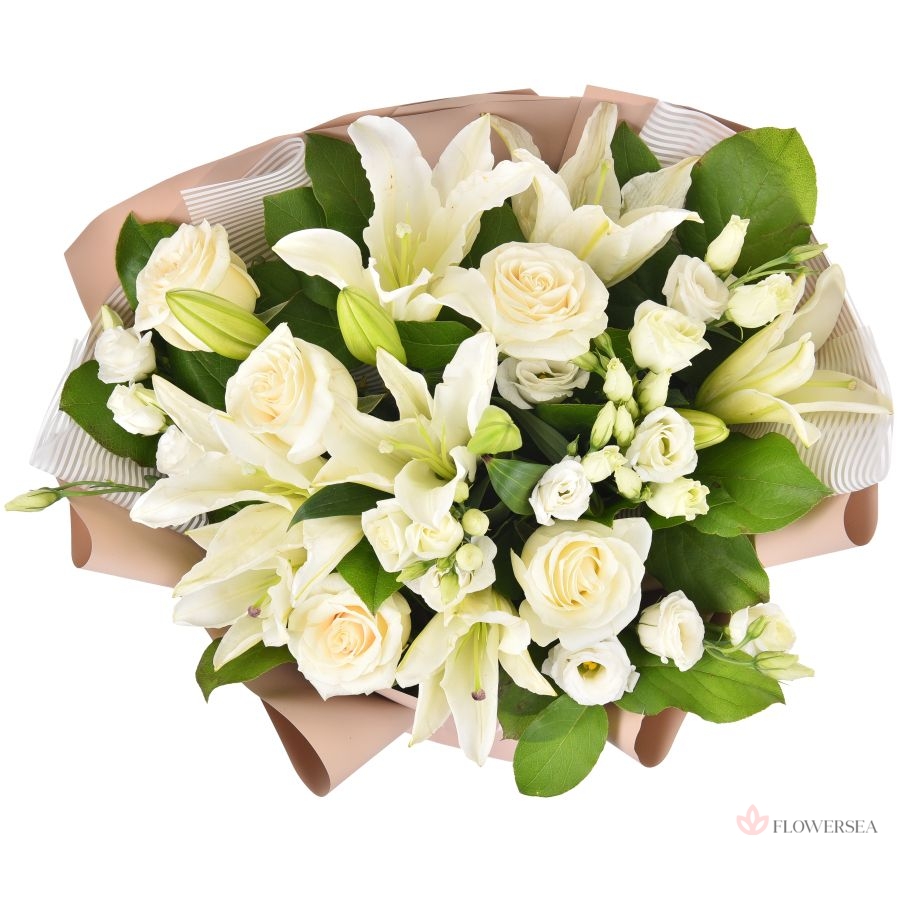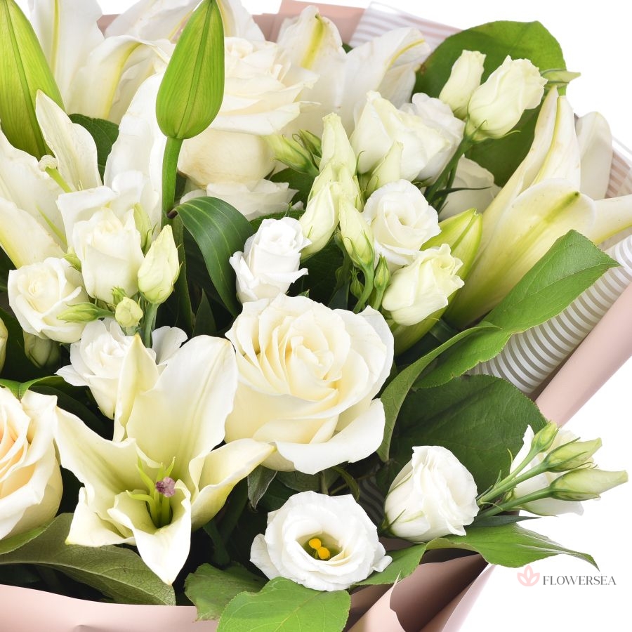 Ніжний букет у красивому оформленні виконаний з 3 гілок білих лілій, 5 білих троянд, 5 гілок білої еустоми та зав'язаний атласною стрічкою. Таку красу актуально подарувати з нагоди кожного свята та урочистостей, особливо актуально до Дня весілля, з нагоди романтичного побачення, річниці та кожного урочистого заходу.