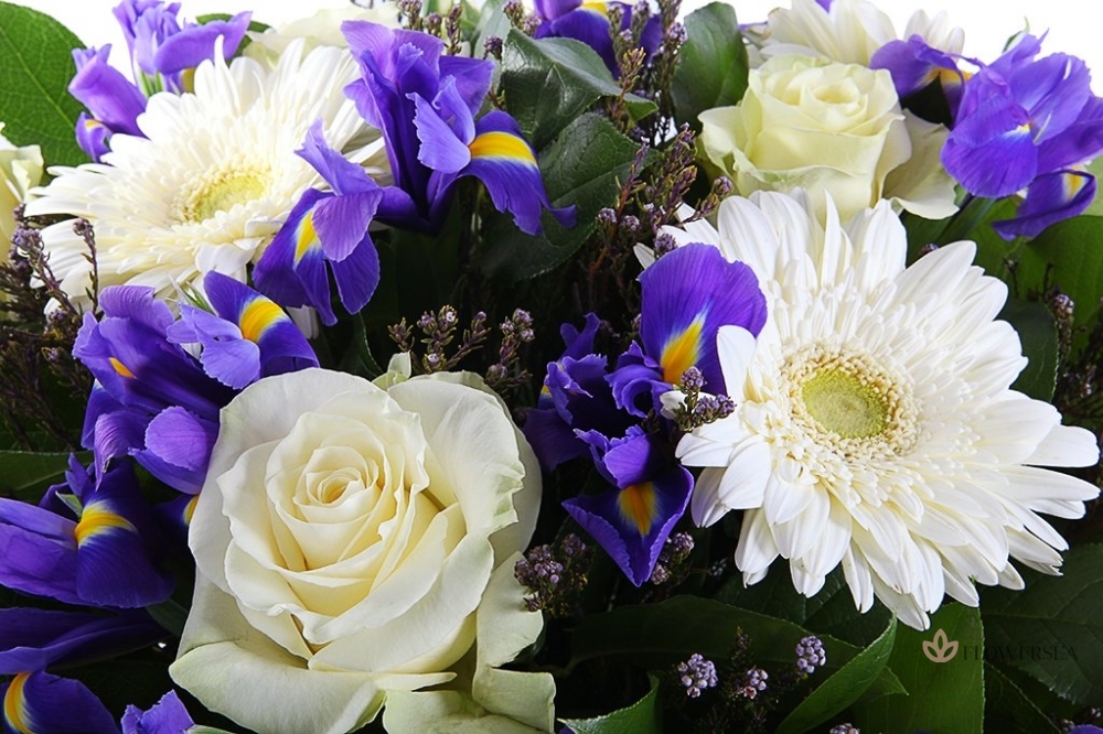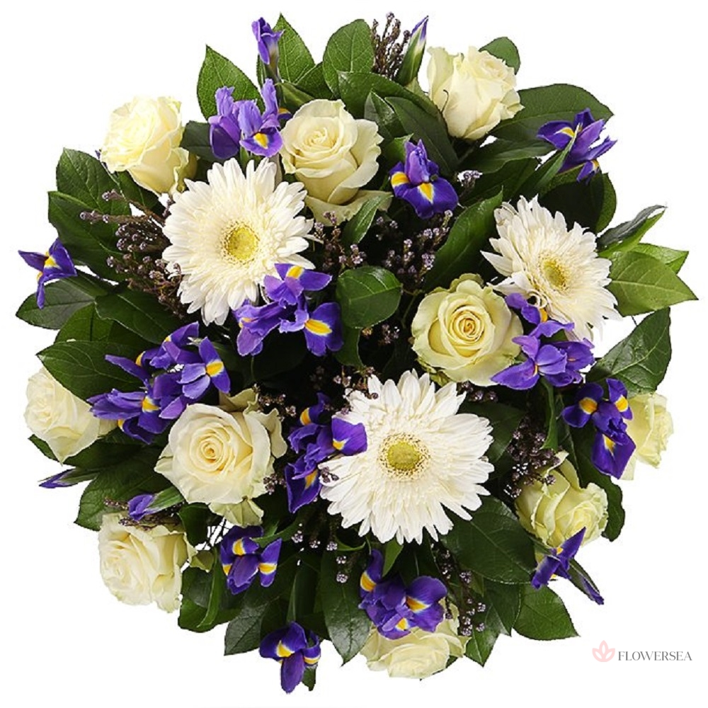 Букет з 10 троянд, 10 ірисів, 3 гербер, декоративної зелені, підкреслений атласною стрічкою.