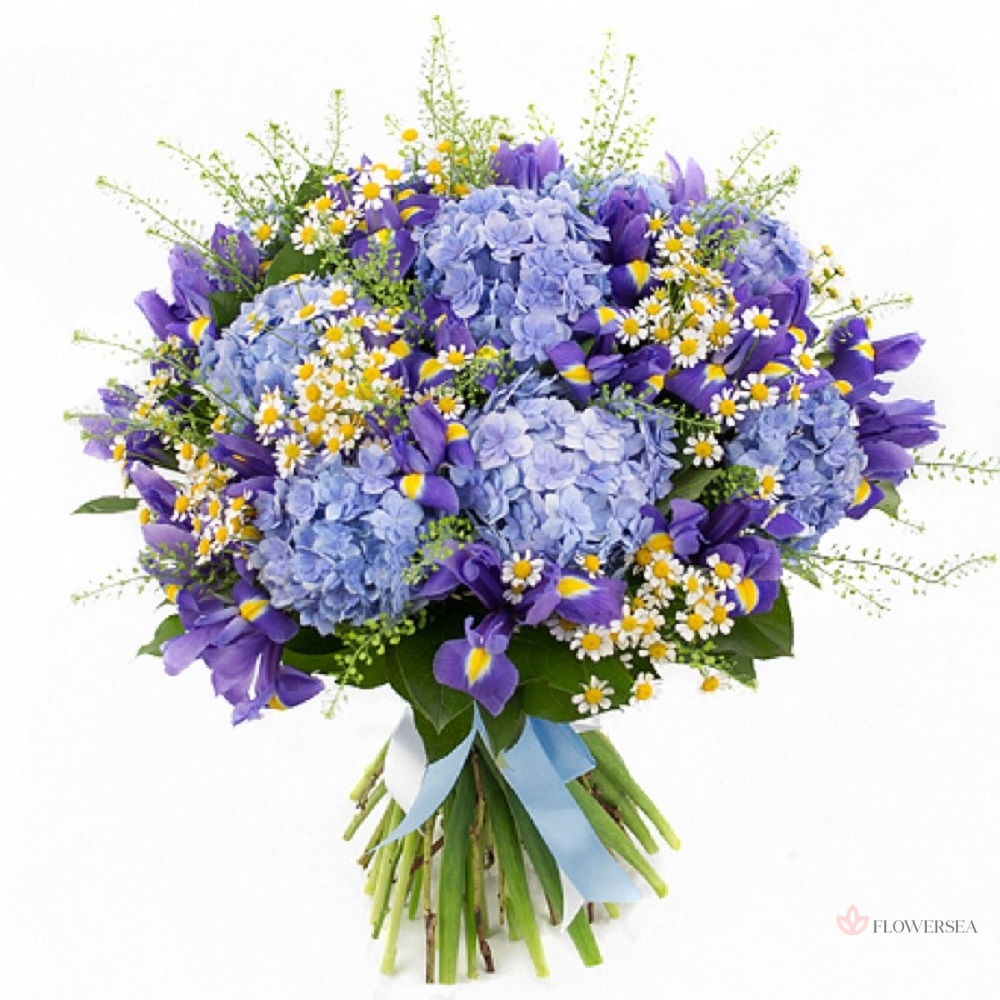 Хмара ніжності, вишуканості та стилю, яскраво виражена в шикарному букеті з 7 гілок чудової гортензії, 20 ірисів, 10 гілок танацетума, безлічі декоративної зелені, і атласної стрічки.