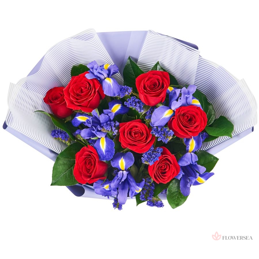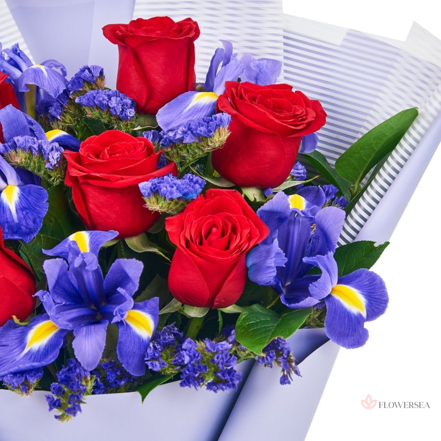 Креативний букет виконаний з 7 червоних троянд, 6 синіх ірисів, гілочок статиці, оформлений у гарний папір та зав'язаний атласною стрічкою. Такий подарунок актуально вручити як представниці прекрасної статі, так і чоловікові будь-якого віку.