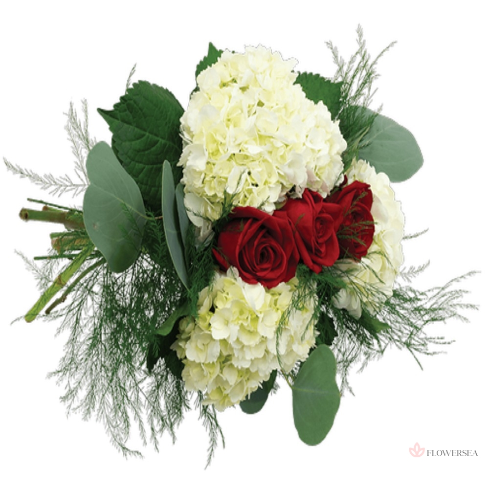 Букет з 3 гілок ніжних і неординарних гортензій, 6 троянд кольору любові, пристрасті, поваги і подяки, декоративної зелені і рафії.