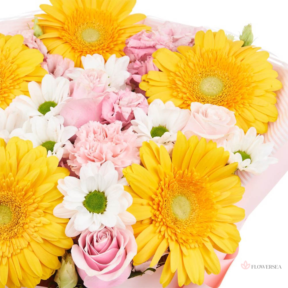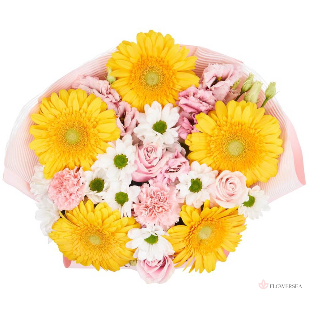 Ніжний букет з 5 жовто сонячних гербер, 3 ніжно рожевих троянд, 4 рожевих гвоздик, 3 кущових хризантем та декоративного оформлення.