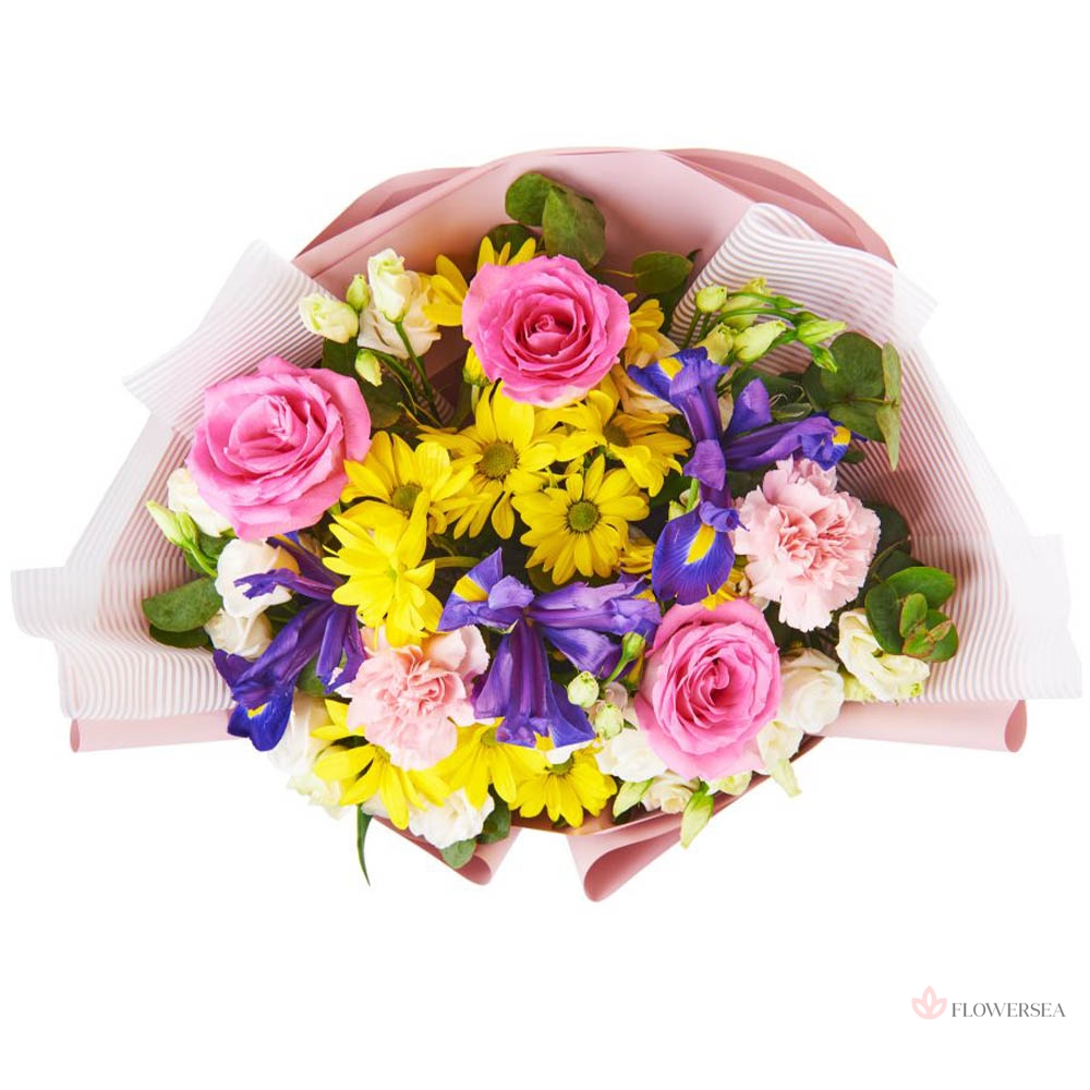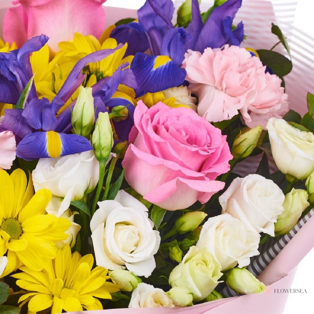 Ніжний, літній та романтичний букет виконаний з 3 рожевих троянд сорту Аква, 3 рожевих гвоздик, 3 синіх ірисів, 3 гілок жовтих хризантем, 3 рожевих еустом, гілок евкаліпта, квіти оформлені в папір та зав'язані атласною стрічкою.