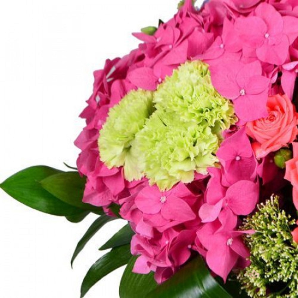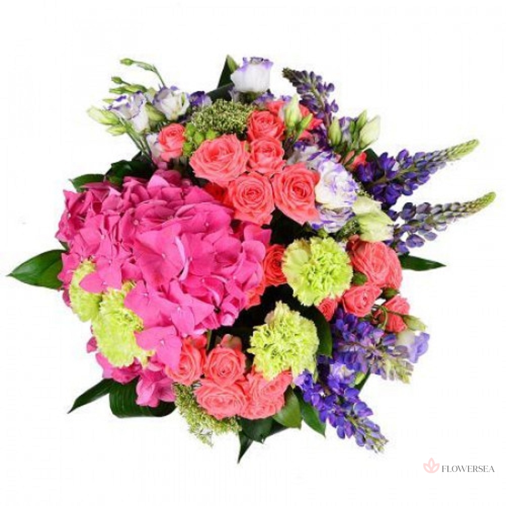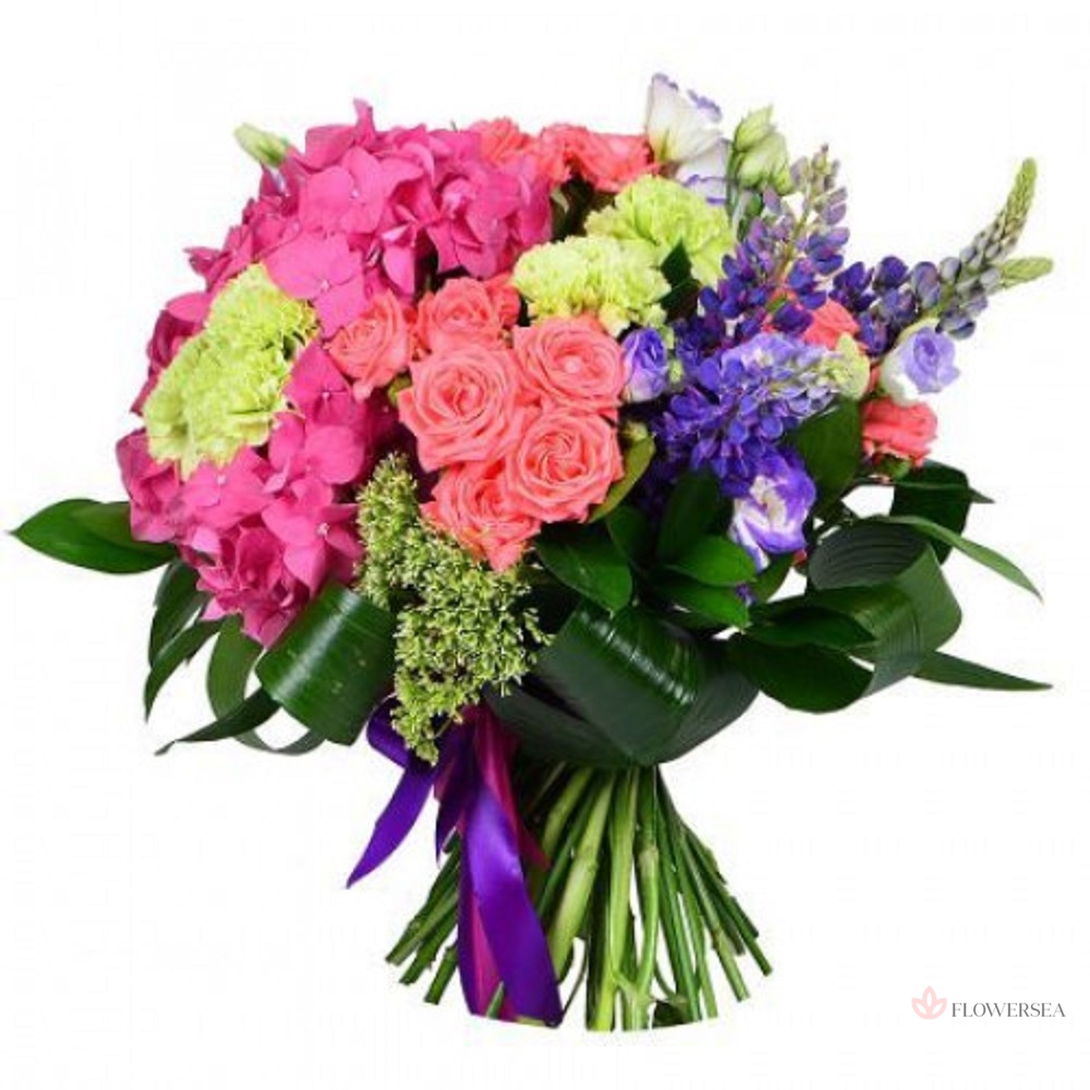 Букет з 2 гортензій, 5 гвоздик, 4 кущових троянд, 4 еустом, 5 гілок люпину, трахеліума, листів аспидистри, рускуса, і атласної стрічки.