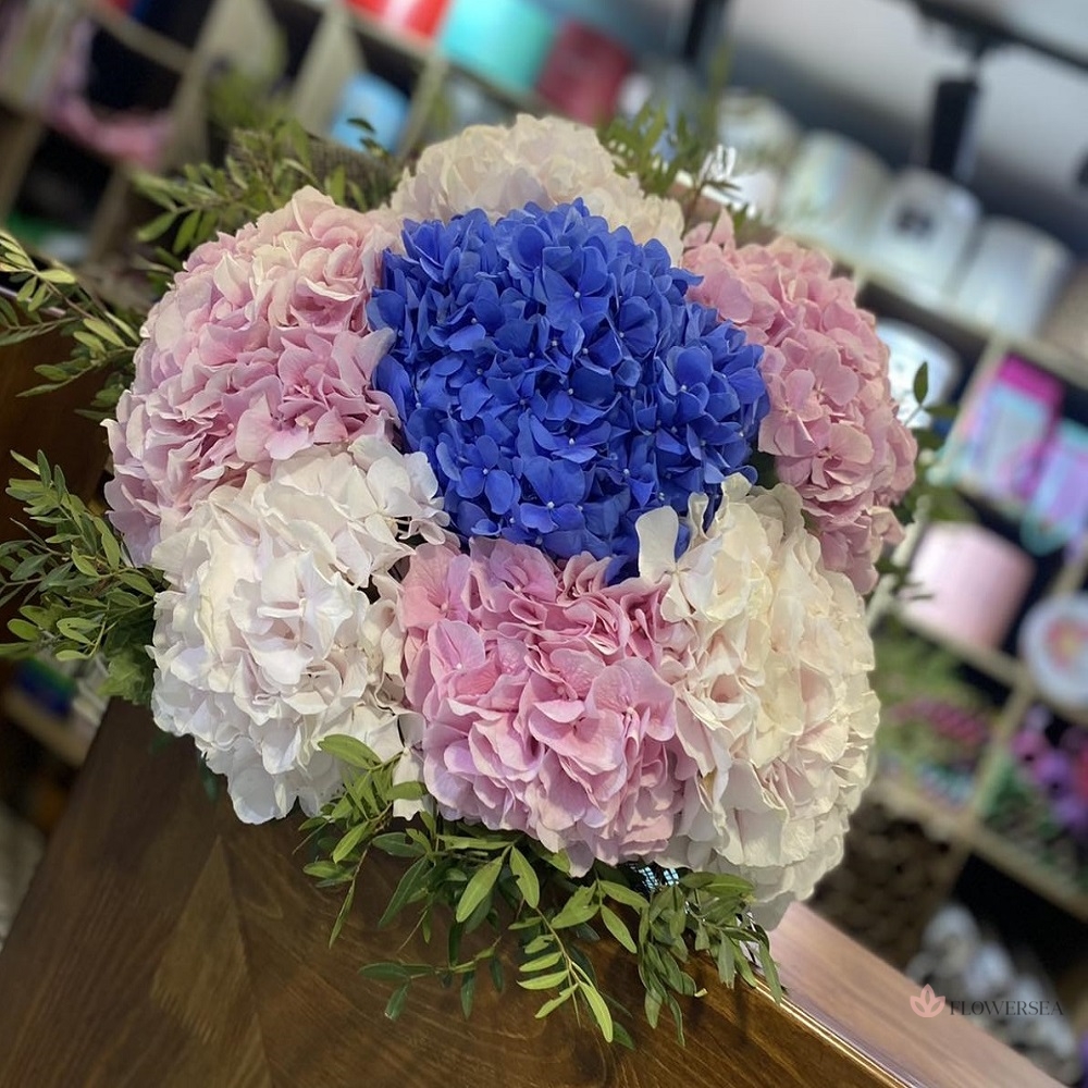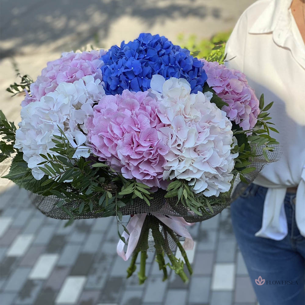 Букет з 7 гілок розкішної, вишуканої, стильної, і завжди шикарної гортензії, підкресленої гілками рускуса, і атласною стрічкою.