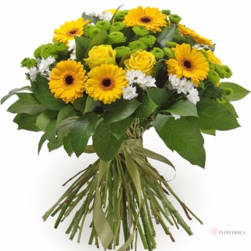 Букет з 5 троянд, 7 гербер, 7 гілок двох сортів кущових хризантем, гілок рускуса, і атласної стрічки.