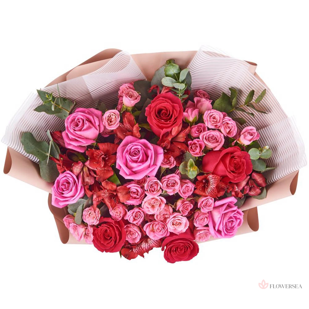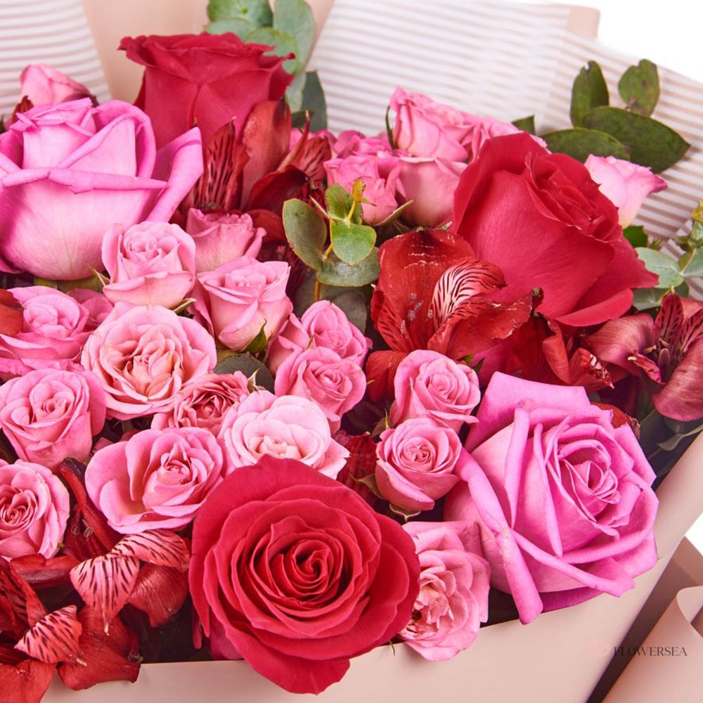 Стильний букет із 4 червоних троянд, 4 рожевих троянд, 3 гілок червоних альстромерій, 4 кущових троянд, гілок евкаліпта оформлений у декоративний папір та зав'язаний атласною стрічкою.