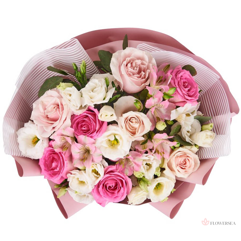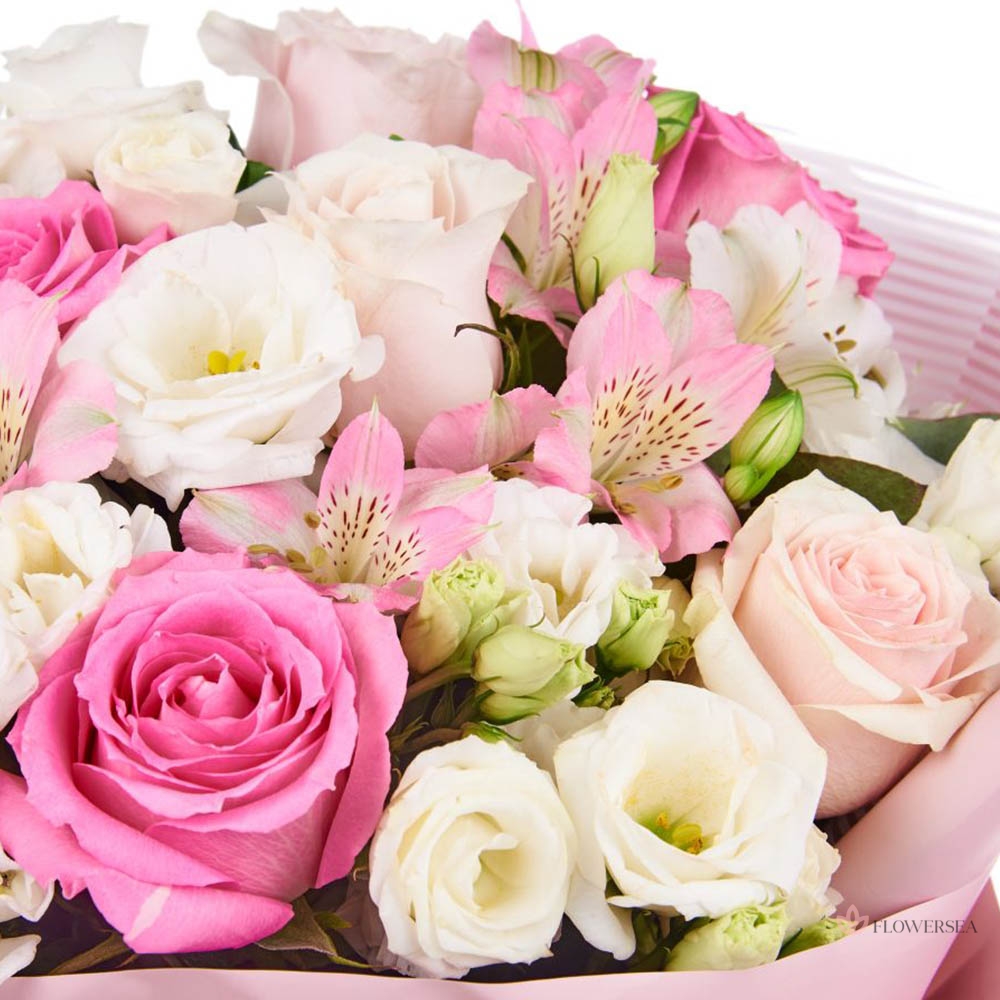 Ніжний букет з самих жіночних квітів, 4 рожеві троянди, 4 ніжно кремові троянди, 4 гілки альстромерії, 3 гілки еустоми. Квіти оформлені в декоративний папір та зав'язані атласною стрічкою.