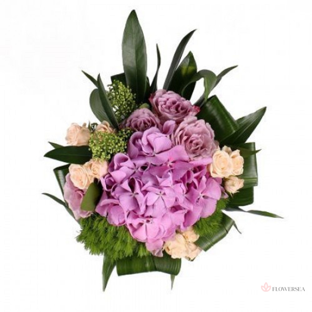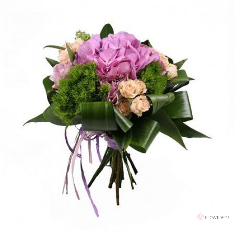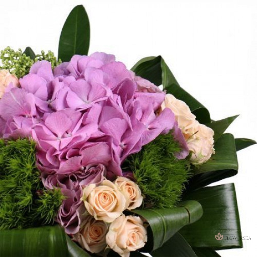 Букет з рожевої гортензії, 5 кущових троянд, 5 бузкових троянд, скіммії, трахеліума, листів аспидистри і рафії.