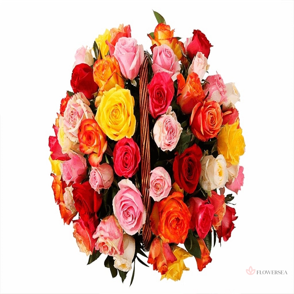 Кошик з барвистих та урочистих різнокольорових троянд імпортних сортів із декоративною зеленню.