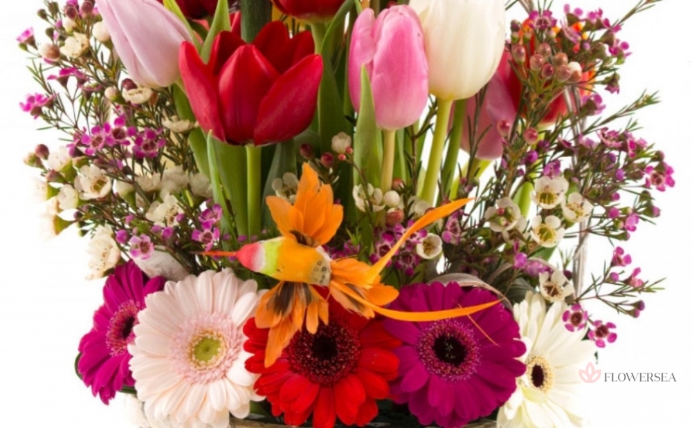 По літньому барвиста галявина квітів у декоративному кошику виконаному з 11 яскравих різнокольорових тюльпанів, 10 гербер насичених квітів, гілок хамелаціуму і всією цією красою прилетіла помилуватися пташка колібрі. Частинка літа, радісних емоцій, моря усмішок і захоплень, і все це в одній чудовій композиції.