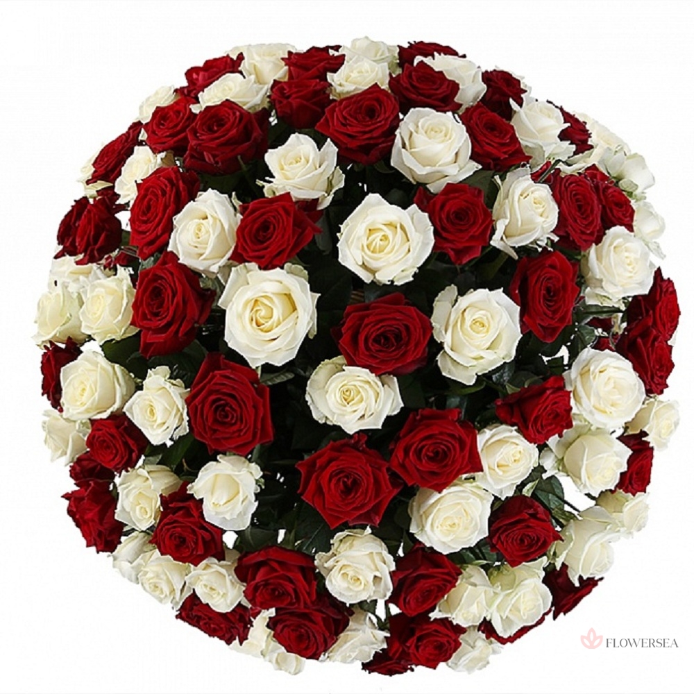 Кошик із 51 троянди червоного та білого кольору з декоративною зеленню.