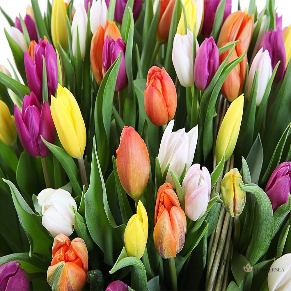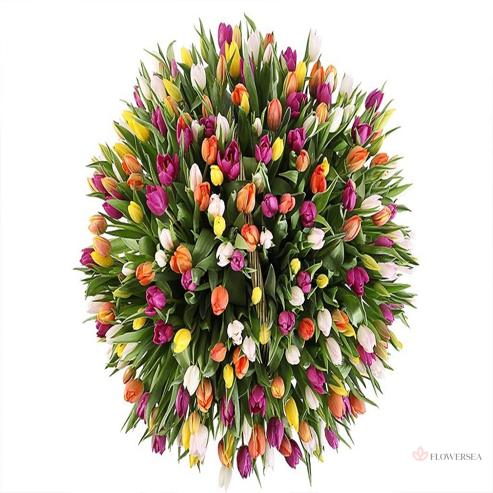 Кошик зі 101 тюльпану різних кольорів із декоративною зеленню.