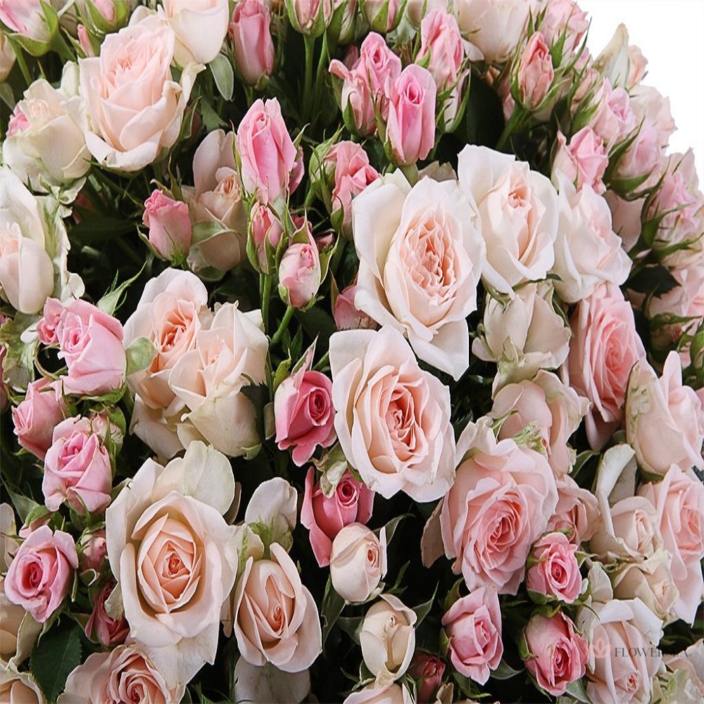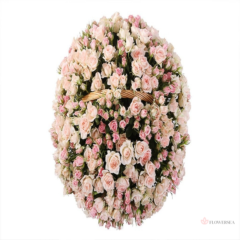 Шикарна хмара з ніжних та романтичних кущових троянд у кошику із зеленню. Гарний, урочистий та святковий подарунок.
