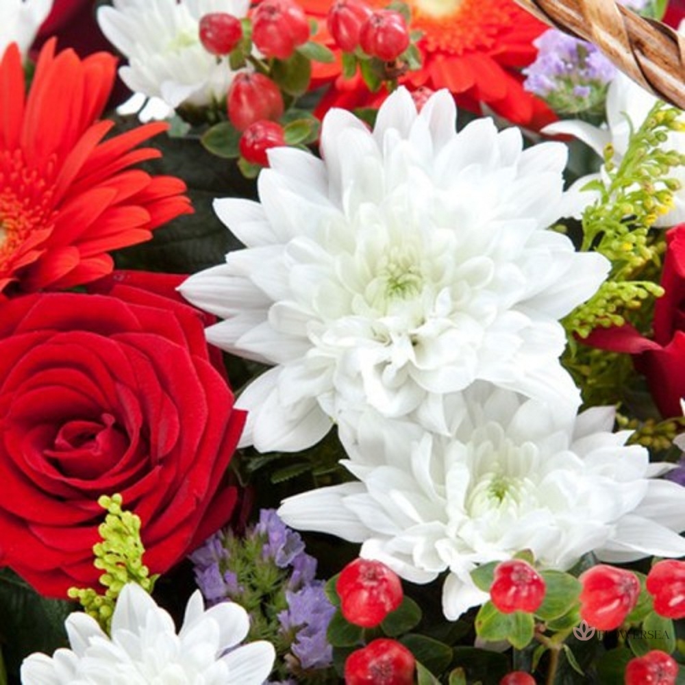 Класичний вітальний кошик із 9 троянд сорту Гран Прі, 3 гербери, 5 гілок хризантеми, гілки гіперикуму, статиця, декоративна зелень, листи папороті.
