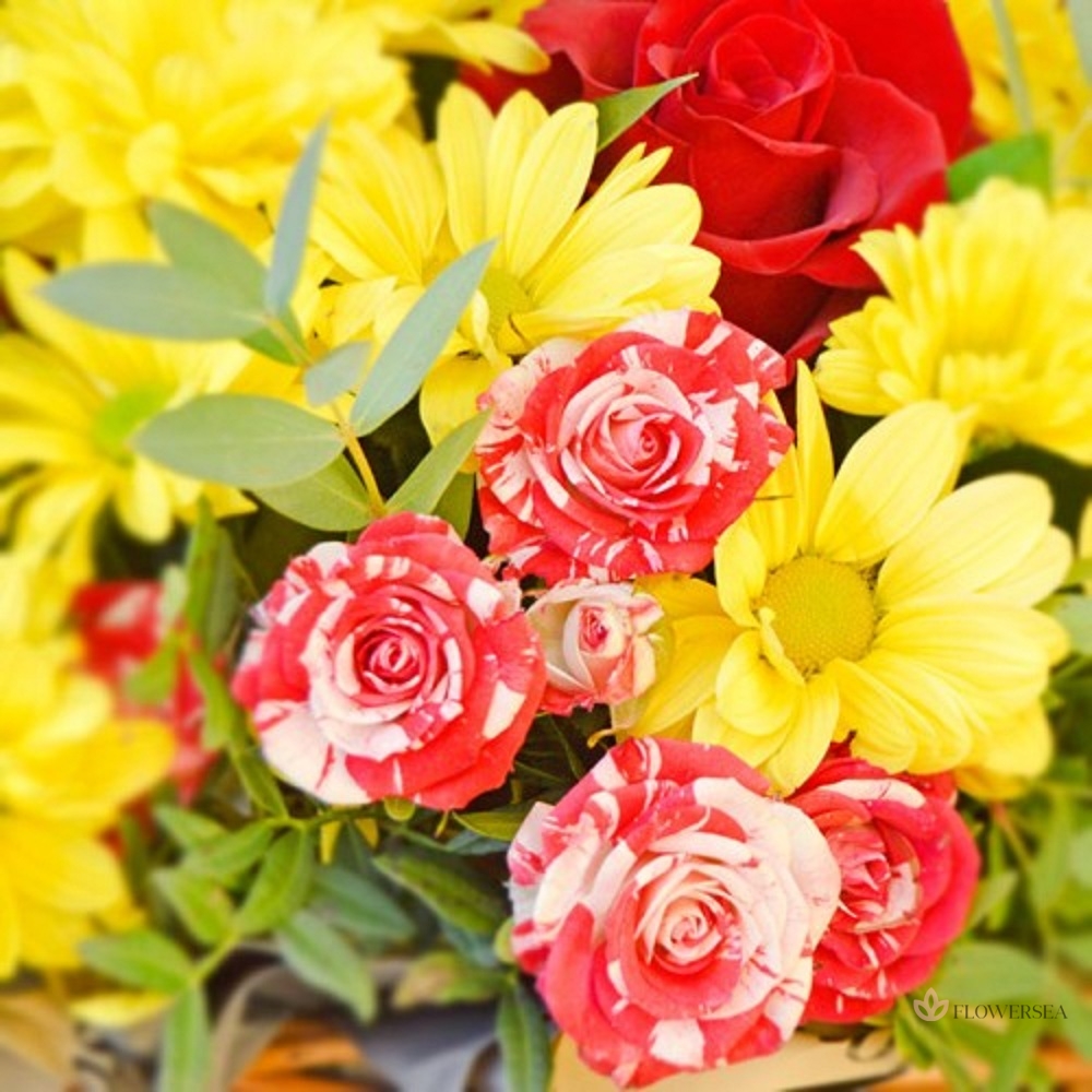 Кошик з 3 троянд, 3 кущових троянд, 3 гілок хризантеми та декоративної зелені.